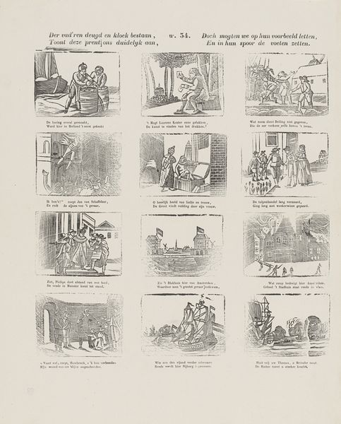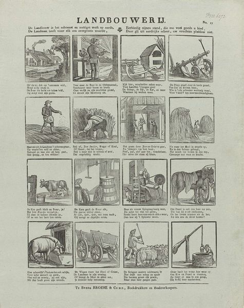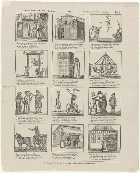Curator: This is an interesting print produced circa 1822-1849 by Schalekamp & Van de Grampel, currently residing in the Rijksmuseum. The title translates to "See, dear youth, here are things depicted again / Whose distinct nature surely appeals to your attention." Editor: My first impression? It feels like a charming educational game! All these small, vignette-like scenes packed together, rendered in that old engraving style... there’s a whimsical sense of order here, almost like a sampler of life's little lessons. Curator: Exactly. Prints like these were common teaching tools, employing narrative and genre scenes to instill values. Each tableau, paired with didactic verses, served as a springboard for moral discussions within families and classrooms. Editor: And look at the imagery! You've got the tradesman, the hunt, exotic locales with camels... each evokes a certain idea. I wonder how children, or even adults, at the time interpreted the connection of parrot cages and scattered fruit? Perhaps some idea around careless use? Curator: The organization, or perhaps more accurately, juxtaposition of diverse elements would certainly have been quite deliberate in conveying layered ideas around morality and proper conduct, shaping both the observer and social values as it permeated everyday life. The very act of teaching with images can reflect institutional authority. Editor: It’s incredible how loaded each miniature scene becomes with symbolic meaning. It’s not just a representation; it's an entire narrative condensed into these small, digestible pieces. You see the man felling the trees. What's he building? Curator: It's possible, yes. Moreover, we must see it within its economic and social context as this print itself is participating in, even building, social frameworks. Its mass reproducibility and widespread distribution indicate that these educational and moralizing notions spread wide. Editor: This artwork really brings the visual culture of the early 19th century to life and reveals how we might understand symbolic communication between humans as continuous today, no matter the medium. Curator: Absolutely. It emphasizes art’s function within civic structures; the use of imagery isn’t merely decorative, but also a political practice aimed at shaping public life.