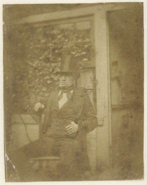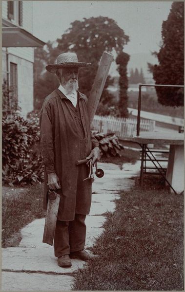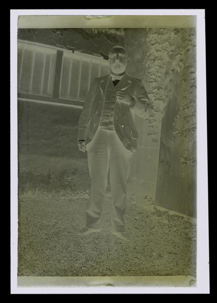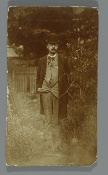 Curator: This is a photograph from 1907 titled "Constantin Mitrofanovitch Flórinsky, Officer of His Majesty Tzar Nicholas II (Jaeger Regiment)." It's currently part of the collection at the Metropolitan Museum of Art. Editor: It has such a solemn feel. He stands rigidly with a cane against this blurred autumnal backdrop, framed by formal garden elements. There’s something undeniably melancholic about it. Curator: And he *is* positioned formally. Notice the details that speak to his station and military role—the meticulously tailored greatcoat, his assured pose, the very deliberate way he holds the cane, a known marker of the elite. This photograph seems carefully constructed to project an image of power and order, deeply embedded in the Imperial system. Editor: The lighting and the color palette are evocative. While seemingly realistic, the photograph employs symbolism through color to signal the sitter’s significance. His attire and the surrounding railings almost blend tonally, unifying his sense of status within this historical context. Curator: I find that point interesting given what we know of the broader cultural trends at that time in Russia. While photography was gaining popularity as a tool for social documentation, it was also being used to reinforce established power structures. Portraits like these played a vital role in maintaining the Tsar's image and influence. Editor: It also hints at how an image may influence what power we assign to that sitter. How does Flórinsky want to be seen? Note the symbolism in the formal wear versus the casual elements in the backdrop, where autumn mirrors the ephemeral nature of worldly status, as everything shifts and falls from its initial placement in time. Curator: That interpretation, from an iconographic perspective, sheds an insightful light on the portrait. The image could suggest an awareness of impending change— perhaps the societal shifts bubbling beneath the surface of Tsarist Russia? Editor: Maybe. Perhaps in gazing at it, we project the present back on the past, finding hints of the inevitable fall. Curator: Whether Flórinsky fully realized those changes, he wanted to make sure this portrait presented a steadfastness through very calculated and material displays of visual imagery. Editor: And this portrait remains as an enduring cultural symbol of not only the subject, but a visual moment ripe with potential, now forever crystallized.