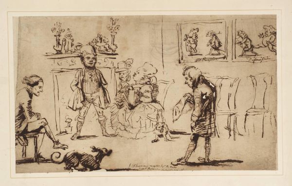 Curator: Look at this whimsical pen and ink drawing; a study for a title page from Punch, Volume 55, dating back to 1868, by Charles Samuel Keene. Editor: Oh, I love the energetic, scratchy lines! It feels spontaneous, like catching a fleeting thought. Is that a play unfolding? Curator: Precisely! It seems to be a rehearsal, a scene from a play with various figures adorned in theatrical costumes, and yes, there’s even a little dog observing from the lower section. Notice the material realities embedded here. The relatively inexpensive nature of pen, ink, and paper democratized image-making, allowing for the rapid dissemination of social commentary through publications like Punch. Editor: The costumes, the stage, even the ink itself – they are all materials performing their roles! It is really cool, each quick stroke loaded with purpose. I can feel the pulse of the theater and the artist's hand. But the composition seems almost... improvised? Curator: Indeed, that seeming improvisation is key to the artwork's success. The visible layering of lines, achieved through cross-hatching with a pen, wasn't about creating something ‘perfect’. It was meant for reproductive techniques. These marks allow it to translate through printing, thus creating wider social availability. Editor: You are right; it really makes you think about the Victorian public absorbing this imagery weekly! And now, viewing this material from today, it's a direct link to their era, you can also make out '68 on the right side. Makes me consider the conversations it stirred in its original setting. Curator: Well said. By appreciating the intersection of materials, labour, and social satire here, one starts to appreciate Keene’s artwork outside the usual restrictive "high art" categories. The essence is about accessibility and critical reflection, captured beautifully by a deceptively simple drawing process. Editor: Right! So much more than just "a drawing," it is a witness to a time, an event, a way of life. Curator: Indeed! So next time you view art, ask: what dialogues are happening? Then look closely: what did the artist use to make the artwork, and perhaps most significantly, who was it meant to be consumed by.