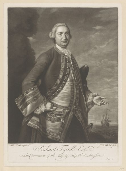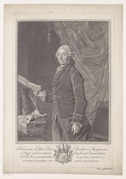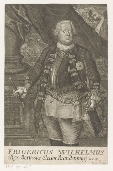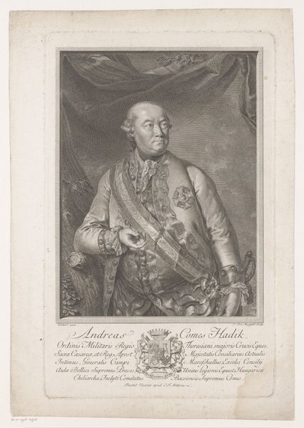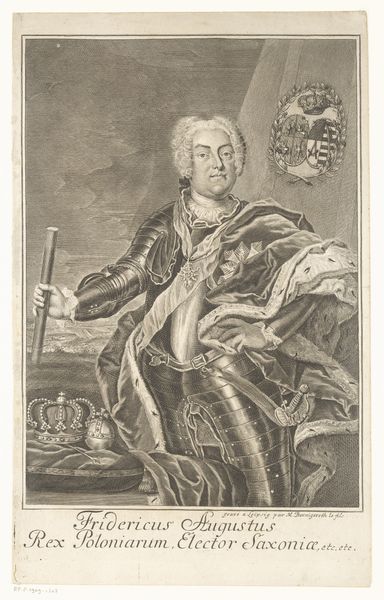 Georg Friedrich Schmidt made this portrait of Augustus III, King of Poland using engraving, a printmaking technique involving carving lines into a metal plate. Notice the incredible detail achieved through this meticulous process. The lines define not only the king's features, but also the textures of his luxurious clothing and the rich drapery behind him. Engraving demands immense skill and patience, a testament to the engraver's virtuosity and the value placed on craftsmanship in the 18th century. The choice of engraving as a medium is significant here. Printmaking allowed for the widespread dissemination of images, making this portrait of the King accessible to a broader audience. Consider the social implications: while the King embodies power and privilege, the print itself democratizes his image through skilled labor and a mechanical process. This challenges the traditional hierarchy between artist and subject, and also "high" art and "low" craft.