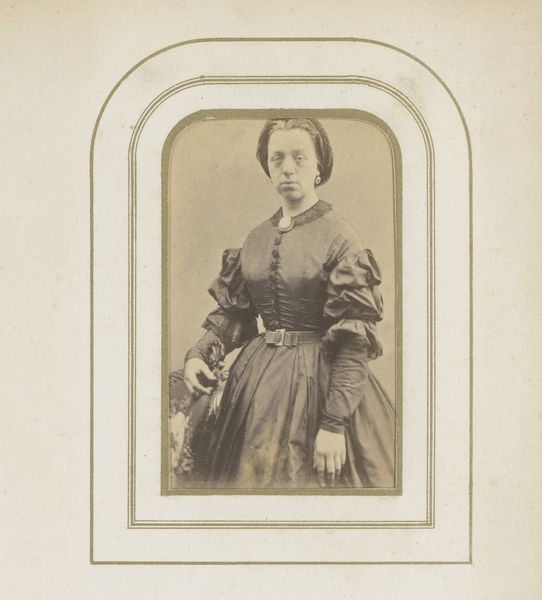 This photograph, "Portret van een zittende vrouw, en profil," was created by Roelof Loots, a Dutch artist born in 1814. The woman's profile is framed by the formal conventions of 19th-century portraiture, yet there is a tangible sense of individuality, visible in her posture and the set of her jaw. Seated and gazing off to the side, her striped dress suggests a certain social standing while her reserved demeanor speaks to the limited roles available to women of the time. Photographs like this offer a glimpse into the lives of ordinary people, allowing us to reflect on the historical conditions that shaped their identities. This image makes me consider the complex interplay between societal expectations and individual agency in the 1800s, particularly for women.
