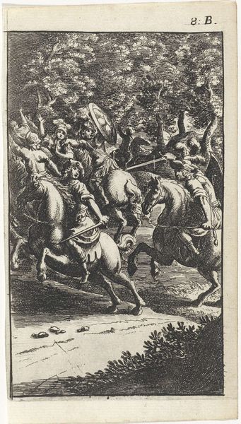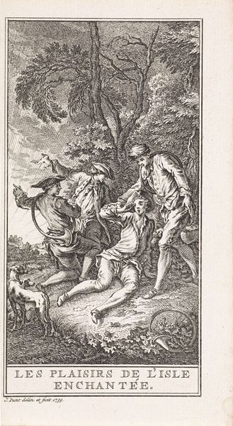 This etching, "Three People Around the Body of a Soldier," by Abraham Dircksz. Santvoort, presents a scene charged with contrasting energies. The delicate hatching creates texture and volume in the figures, and the composition guides our eye from the fallen soldier in the foreground, to the figures in the background. The figures are arranged across the picture plane in a non-symmetrical way that creates both tension and compositional balance. This asymmetry unsettles any stable interpretation, suggesting a world where tragedy disrupts established orders. The landscape of the setting is densely packed to create a somber tone. The soldier’s collapsed pose challenges classical ideals of heroic strength. It’s an interesting interplay of classic structure that acknowledges the breakdown of traditional values amidst a chaotic and violent world. The artist draws our attention to the unsettling aesthetics of human conflict.