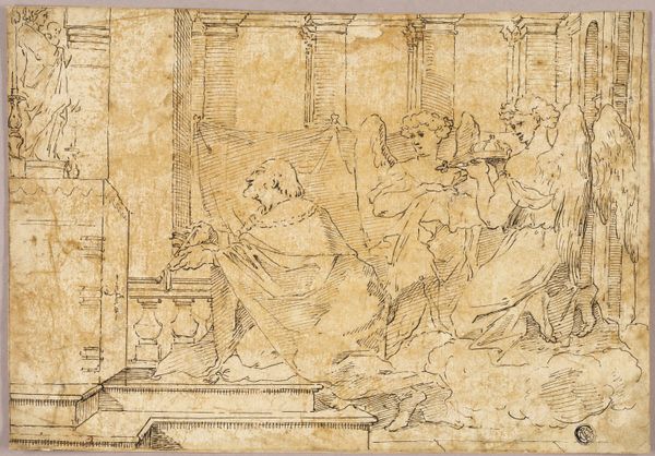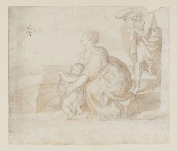 Editor: We're looking at C.G. Pilo's 1794 plaster relief, entitled, "\u00c6neas hindres af Venus i sin h\u00e6vn mod Helena, som har s\u00f8gt tilflugt ved Cybeles alter." Quite a mouthful! I'm struck by its neoclassical austerity, and how that contributes to the sense of a solemn moment frozen in time. What are your thoughts? Curator: Frozen in time is perfect. Pilo’s caught \u00c6neas mid-stride, divinely dissuaded. Isn’t it incredible how Pilo conveys such dynamism within the limitations of plaster? You feel the tension, the pull between duty and...well, maybe just plain old vengeance. I mean, who hasn't felt held back from something they were sure they needed to do? Editor: Definitely! So, what’s the story behind this specific moment he's depicting? Curator: Think the *Aeneid*, but Pilo gives it a little twist. Aeneas is all set to get his revenge on Helen, you know, for all the trouble she caused with the Trojan War, but then Mom – Venus, in this case – steps in and says, "Nope, not today, son. There are bigger things to worry about, like founding Rome." Cybele's altar acts as a place of sanctuary here. Talk about being saved from yourself, or, you know, your own family. Editor: Right, history averted! It's interesting how this is a relief, kind of like history etched in stone... or, well, plaster. So, beyond the literal story, what does this piece tell us about that era, about the artist himself? Curator: I think Pilo really encapsulates the Enlightenment ideal of reason prevailing over passion, the control that art and artists believed they could exact from emotions or subjects... And plaster felt "pure," didn’t it, almost archaeological—connecting directly back to those “civilized” ancient roots the late 18th Century obsessed over. Almost like Pilo is presenting a morality play in sculpted form. But even here, I wonder if he is also wryly poking fun at it with those soft almost sensual female forms. Editor: That makes perfect sense. I'm definitely going to look at it in a new light now, considering that balance between passion and reason and how its tangible form echoes antiquity! Curator: It's all about layering the narrative, right? Seeing those echoes bounce across centuries...that's where the fun really starts.