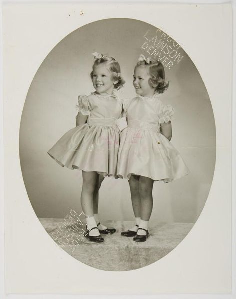This photograph of two young girls in matching dresses standing in front of a window with slatted shades, was created by Paul Gittings. The absence of a date complicates our understanding, yet we can still examine the image through a contemporary lens that explores the construction of identity. The matching dresses and posed stance suggest a desire to present a unified image of ideal girlhood. This conformity can be seen as a reflection of societal expectations placed on young women during the time the photograph was taken. What does it mean to grow up under the gaze of such expectations? Despite the uniformity, there is also a subtle tension. The girls are individuals, yet their identities are blurred by the matching attire. In this way, the photograph invites reflection on the complexities of girlhood, and societal expectations around identity and conformity.