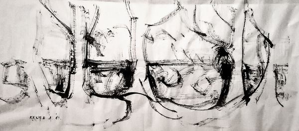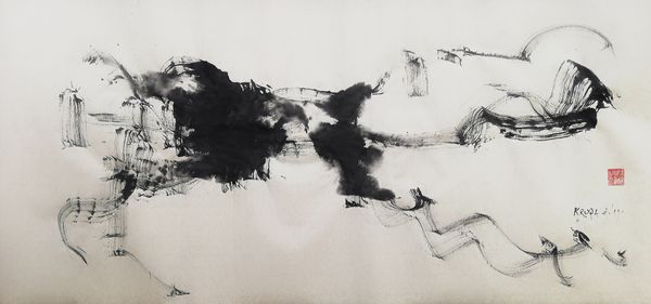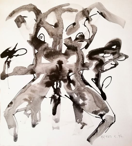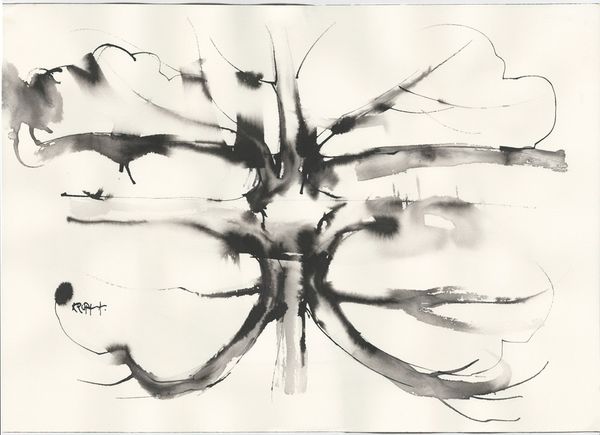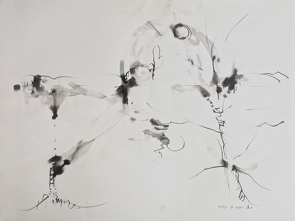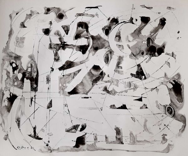 Alfred Freddy Krupa made this painting, “My everyday grey,” using ink on paper, and just look at what he does with it. It’s all about the process, isn’t it? The way the ink bleeds and pools, creating these unexpected shapes. The ink is thin, watery almost, allowing it to flow freely across the surface. And it's the surface, that bright white paper, that really makes the piece sing. The contrast between the stark white and the fluid grey is so striking. Take a look at that dark splodge on the left, how it drips and spreads, creating a sense of movement, and holding a dark and inky shadow. It reminds me of Cy Twombly, but with a Japanese twist. Ultimately, this piece is about embracing the unpredictable nature of artmaking. It’s about letting go of control and allowing the materials to guide the way. It’s a conversation between the artist and the medium, a dance of chance and intention.