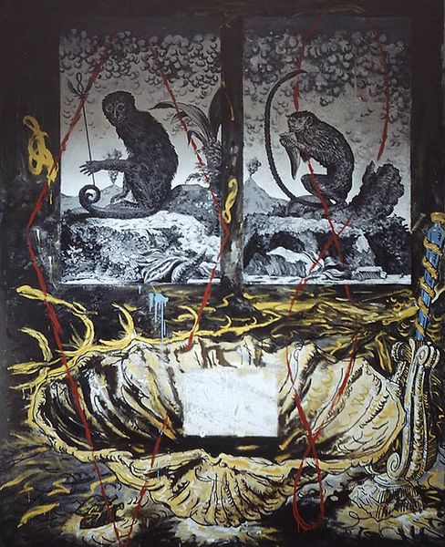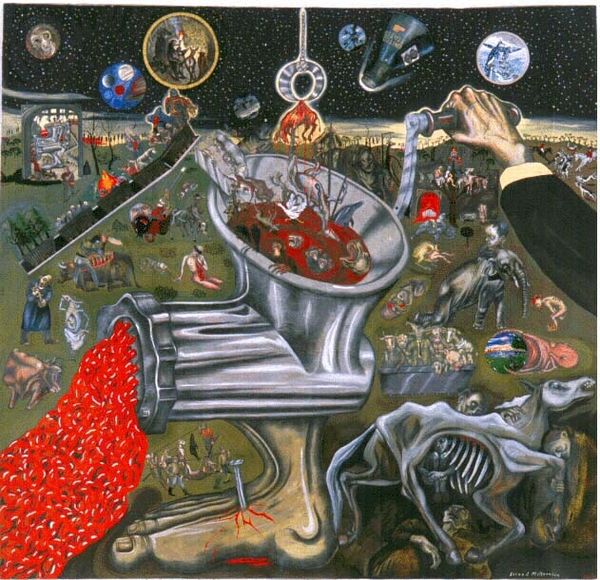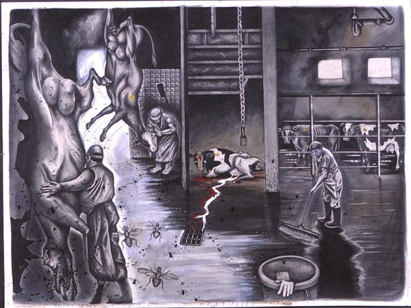 Sue Coe's painting *Mill (fragment)* presents us with a scene dominated by raw, visceral imagery. The composition centres on a vast, metal basin filled with a blood-red liquid, creating a sense of horror and unease. The use of color is striking: the metallic greys of the industrial structure contrast sharply with the vivid reds and browns of the animals' bodies, heightening the emotional impact. Coe uses this contrast to challenge the structural underpinnings of industrial processes, unveiling the brutal reality often concealed by modern society. Through the use of semiotic signs, Coe challenges fixed meanings about progress and questions the viewer's relationship with consumer culture. This piece serves as a powerful critique, destabilizing our perception of ethical consumption and inviting us to re-evaluate the values embedded within industrial production.