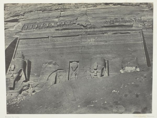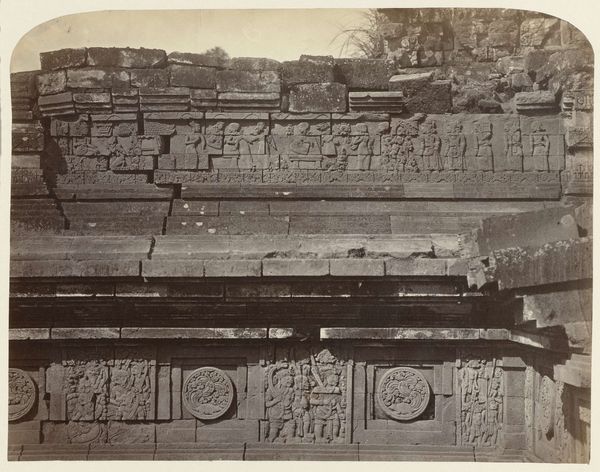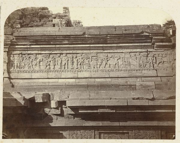 Curator: Here we have an albumen print from around 1867 by Isidore Kinsbergen, depicting a bas-relief that narrates a story of Krishna. It's found on the east side of Candi Panataran. Editor: The overwhelming sense I get from this image is of enduring weight, both literally in the stone, and metaphorically in the stories it holds. It feels profoundly silent. Curator: Indeed. Kinsbergen's choice to use photography allows us to access this narrative frieze across time and space. Notice the detail in the relief; we can discern human figures amidst detailed architectural elements. Editor: The visual language is fascinating. The figures, though small, are arranged in such a way that it's easy to grasp a sense of motion and relationship between them. This narrative must have been profoundly important. The decision to illustrate Krishna suggests his relevance within that specific community and time. It would be worth examining this cultural choice further. Curator: Precisely! Krishna, as a central figure, embodies multifaceted wisdom. His stories permeate generations, representing various ideals, love, and dharma. Editor: Looking closer, the relief is worn, telling its own story. Time and weather have eroded some of the details. There's something compelling in that juxtaposition – the fading physicality versus the endurance of the Krishna myth. Curator: I completely agree. Think about how Candi Panataran functioned as a sacred space where rituals and myths intertwine. The relief solidifies this cultural memory and continuous cycle, in which the story serves as a reminder of ideals to emulate. Editor: What strikes me too is the photographic perspective itself. Kinsbergen’s framing – this almost detached, documentary style – inherently situates him as an outsider observing and recording another culture's beliefs. Curator: That point highlights the complex layers of visual interpretation embedded here. Editor: Seeing this work invites reflections on our ability to grapple with history, mythology, belief, and artistic traditions outside our own experiences. Curator: The confluence of those elements elevates this photo to a profound historical artifact that preserves a spiritual touchstone for future generations.