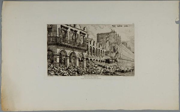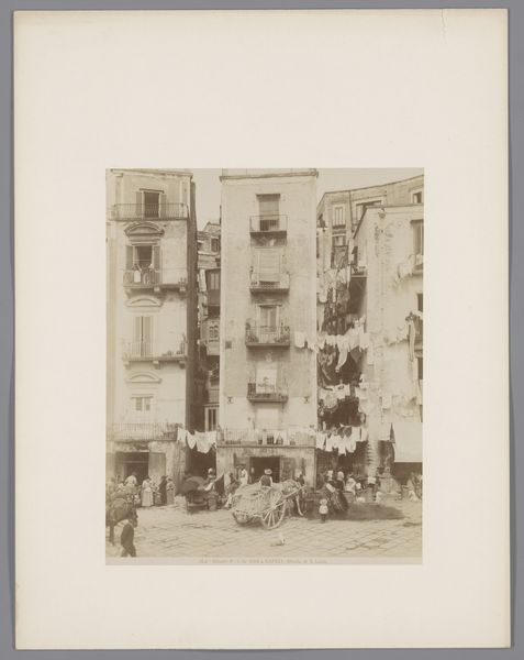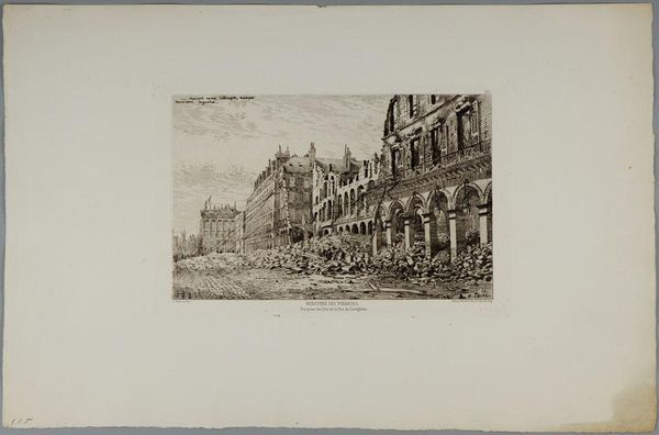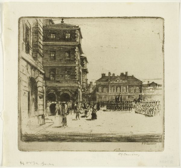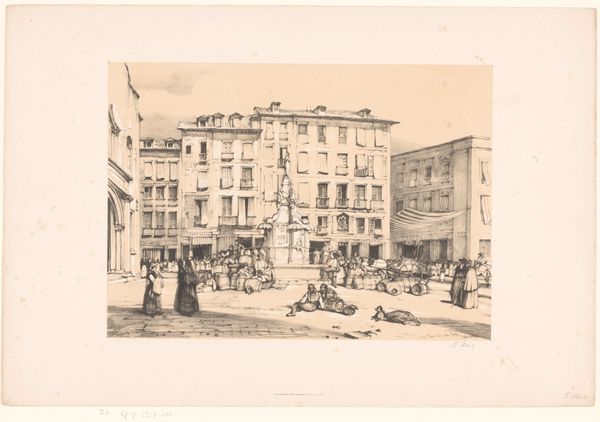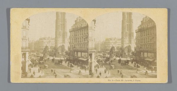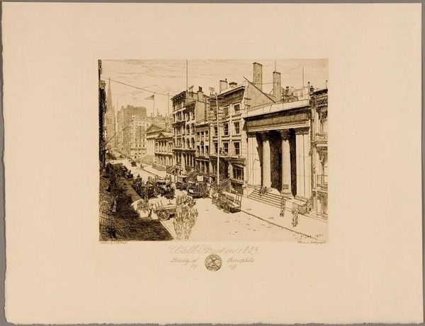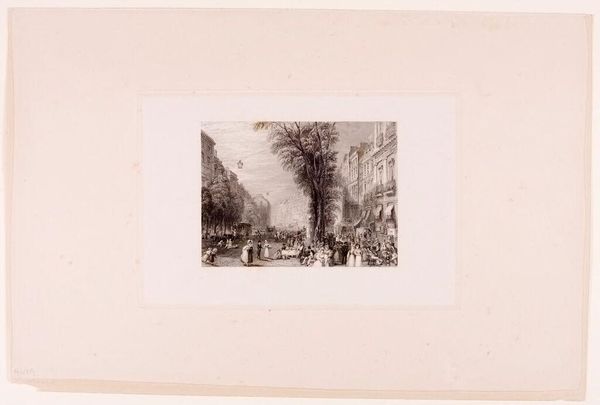 Curator: Sidney L. Smith gifts us a vibrant glimpse of "Broadway in 1865," captured in delicate lines. It's almost ghostly. Editor: My first thought is how much this bustling street contrasts with the turmoil of the Civil War still raging when this was made. Curator: Absolutely! The city pulses, oblivious. I love how Smith renders the leaves, almost like lace on the trees. And the feeling of forward motion, despite the stillness. Editor: That motion underscores the relentless march of "progress," even amid conflict. It makes me think about who gets to partake in such a moment of apparent peace, and who is excluded. Curator: That's a sharp, critical eye. For me, it is a meditation on a fleeting moment, knowing the city will change, the people will be gone. Editor: Exactly. The ephemerality of that moment, juxtaposed with the enduring structures—it's a complex commentary on history, loss, and resilience. Curator: Right. It's a tiny window, but full of big questions. Editor: Agreed. Broadway then, Broadway now—the struggle for belonging continues.