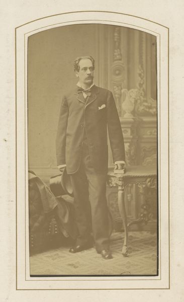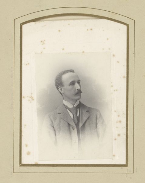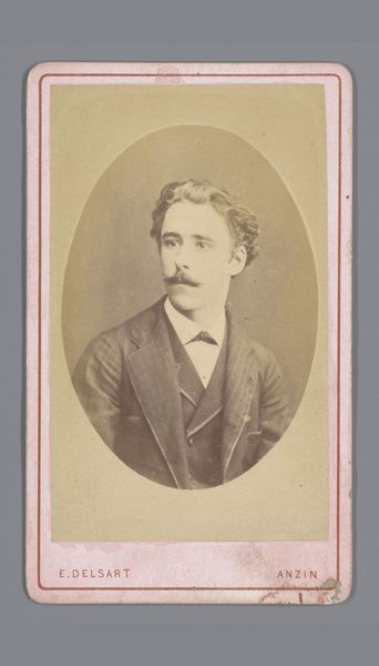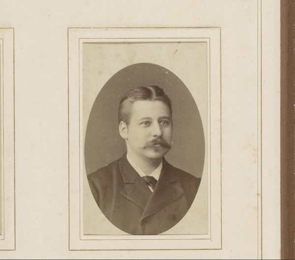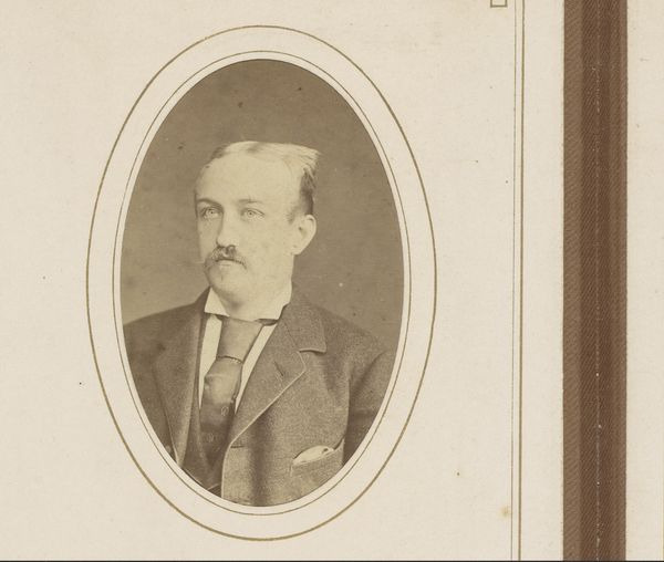 Curator: Today we're looking at a daguerreotype titled "Portret van een man met snor," which translates to "Portrait of a man with a mustache." This photographic print dates from sometime between 1860 and 1900 and captures its sitter with both formality and softness. What strikes you about it? Editor: It feels like a performance, almost theatrical. There's something so staged and melancholic in the way he is posed. The dark suit and background are not really working, but instead convey sadness or even some sort of unease. Curator: Indeed. Let's examine the tonal range; note how the light is captured. There's the strong contrast between the light falling on the sitter's face, highlighting his mustache—certainly a focal point. This use of chiaroscuro, that play between light and dark, really defines the composition, wouldn’t you agree? Editor: Well, it seems the very staging points to ideas of masculinity and societal expectations during the time, you know? A clean-shaven man might signal youth or lower status while sporting the mustache of the moment hints at bourgeois aspiration and patriarchal control. He wants to participate but seems almost imprisoned by it. Curator: An intriguing reading. I would point to the way his suit fits, too. You can observe the detailing of its form, as his expression is relatively relaxed. There’s a tension here—one where, formally, he wants to abide. He may be more constrained than defeated. Editor: His relaxed hand is also a hint about some tension he has given up. Maybe an invitation for new roles for man in this time. The mustache becomes just another boundary crossed as Victorian-era ideals began breaking down around the end of the century, wouldn't you say? Curator: Interesting, indeed! A new vision seems an important takeaway for audiences engaging with this image, perhaps the artist felt that. A detail easily overlooked. Editor: Yes, this helps contextualize not only his presence in history, but the evolving standards for future generations, wouldn't you agree? Curator: Very insightful. Thank you for helping us delve more into this striking image.