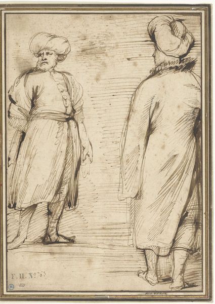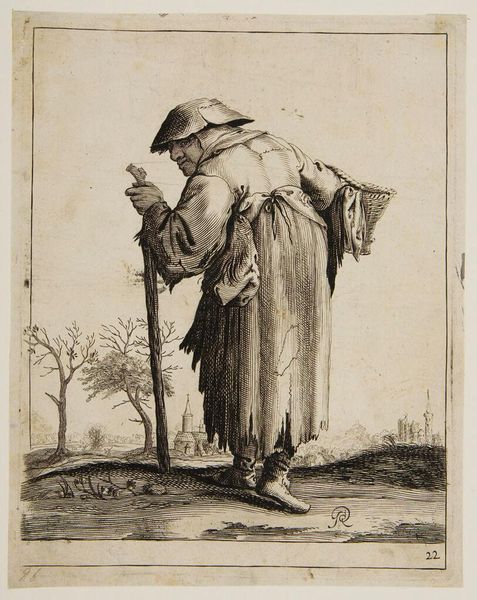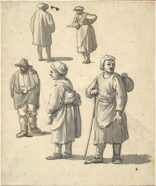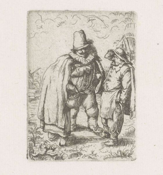 Curator: Pieter Jansz. Quast, who lived from 1606 to 1647, created this piece, titled "Two Men Leaning on a Stick." Editor: It feels like a stage play about to begin! There's a sense of anticipation, or maybe just plain weariness, radiating from these figures. Curator: Quast was a Dutch Golden Age painter and printmaker known for his genre scenes, often depicting peasants and soldiers. This work seems to fit squarely within that tradition. Editor: The detail in their tattered clothes is remarkable—almost tender. You can practically feel the texture of the rough cloth and imagine the dust kicked up on the road. Curator: His pieces really tap into social commentary with a touch of humor, showing the everyday lives of ordinary people with all their flaws and quirks. Editor: I love how they’re connected by that stick, yet utterly disconnected from each other. Each lost in their own thoughts. Curator: Quast captured a shared moment of reflection, maybe even resignation. Editor: It makes you wonder about their stories, doesn't it?
