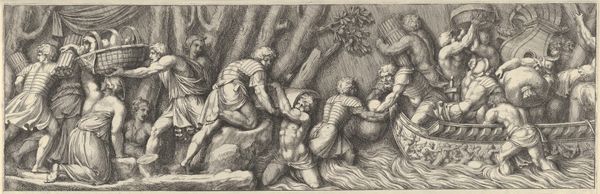 Curator: Here we have J.F. Clemens' print, "Niels Klim hyldes af Qvamiterne, der bringer ham gaver og knæler for ham," created between 1786 and 1788. It's currently held at the SMK, the National Gallery of Denmark. Editor: Whoa, talk about a welcome party! The scale seems intimate, like a secretive, forest ritual. There’s definitely a strange kind of reverence at play. A bit awkward maybe, from Klim's expression. Curator: The etching captures a scene of intercultural exchange—though, to use a postcolonial lens, perhaps one should also add coercion—taken from Ludvig Holberg's satirical novel, *Niels Klim's Underground Travels*. Clemens here visualizes Klim's arrival among the Quamites, who treat him as a god. The composition and this almost exaggerated obsequiousness invites questions about power, representation, and cultural relativism. Editor: It reminds me a little bit of illustrations in old fairy tale books...that sketchy vibe with hints of mystery. Clemens renders Klim so detached from the experience. Makes you wonder what he’s really thinking. It looks like, "please stop". He seems incredibly uncomfortable in what you called the 'visualized intercultural exchange' situation, right? Curator: Exactly. I wonder, from a gender perspective, what that says about these interactions, even allegorically speaking, as some people knee before the man. Also note the presents: they give Klim what? Apples. Why those, I ask myself. Does the novel explain that, too? Or does it reflect ideas on sin, lust, life...knowledge, you know...The male nude adds another interesting layer to this power dynamic. Editor: It all has this understated irony that somehow feels very modern even if Clemens lived two centuries ago! The textures of the forest...the bare flesh...it's a delicious contrast. So, it’s a great picture, because once you are familiar with the cultural baggage, the picture becomes extremely relevant. Curator: Very well said, because without the information behind the artwork, you cannot really dig deep into the social narratives that the artist presents. It forces us to really reconsider what we think of "encounters," so-called civility, and history. Editor: Totally! Makes you question everything, including whether or not to accept strange gifts from nude forest people. Just saying...