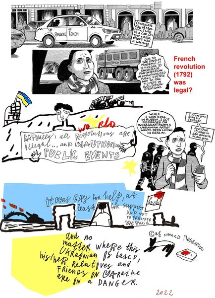 Alevtyna Kakhidze created this untitled drawing using ink and color to explore the complexities of identity and choice amidst conflict. The artwork delves into the nuances of privilege and the moral dilemmas faced by individuals connected to the war. Kakhidze prompts us to consider whether individuals are truly free to make choices, especially when caught between political forces and societal expectations. The inclusion of Joe Sacco's name, known for his war reportage through comics, invites reflection on the role of artists in documenting and interpreting conflict. Here Kakhidze develops an alternative narrative by questioning the concept of choice itself, in the context of the war. This work serves as a reminder of the emotional and ethical challenges faced by individuals during times of political upheaval, urging us to empathize with those navigating complex moral landscapes.
