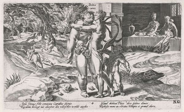 Editor: Here we have Cornelis Cort's engraving, "Hercules Stealing the Golden Apples of the Hesperides," from around 1563. The scene feels incredibly dynamic. I'm struck by how Cort uses line and form to convey movement. What is your reading of the work? Curator: Observe how Cort employs varying line weights to define form and space. Notice, for example, the deep, decisive cuts delineating Hercules’ musculature versus the finer, almost hesitant lines describing the distant garden. This juxtaposition not only emphasizes the hero's physical prowess but also spatially separates him from the ethereal realm of the Hesperides. Editor: It’s interesting how you point out the different line weights, I had mostly paid attention to Hercules figure. Are you saying it makes Hercules appear to be… in higher contrast to the rest? Curator: Precisely. This technique creates a hierarchical visual structure. The eye is immediately drawn to the immediate action and conflict represented by the body of the figure of Hercules in the foreground. How do you interpret the inscription? Editor: I think that based on your reading and analysis, the text can also offer insight into understanding the image itself. Thank you, I hadn't looked at the image that way at all before. Curator: It's through careful attention to such formal devices that we access a richer understanding. I appreciate your insightful response.