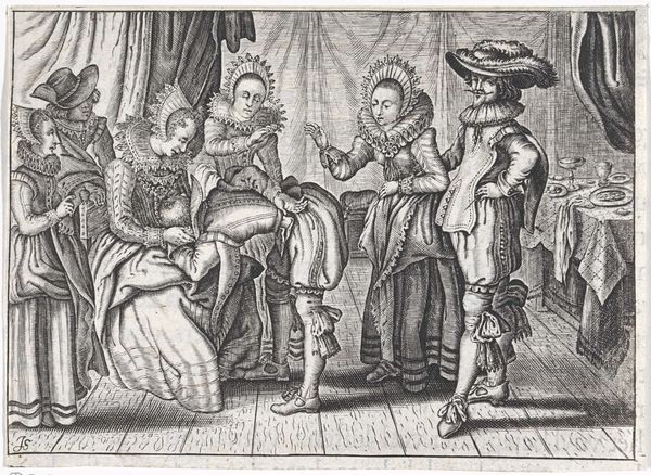 Curator: This is a piece entitled "Tegen wil en dank getrouwd," or "Married Against Their Will," dating back to 1713, attributed to Gilbert Schoute. It's an engraving on paper. The scene seems rife with social commentary. Editor: My first impression is the sheer theatricality. The figures are arranged almost like actors on a stage, the exaggerated expressions lending a certain drama to what could otherwise be a mundane event. Curator: Precisely. Schoute uses caricature to highlight the societal pressures surrounding marriage at the time. It’s a commentary on arranged marriages, where individual desires were often secondary to family alliances and economic stability. Note how the bride appears almost detached, her gaze averted, which underscores a sense of resignation. Editor: And consider the stark contrast of the sharp lines in the figures against the horizontal linearity of the wooden floorboards. It enhances that sense of a rigid environment. But beyond its linear construction, I wonder what we can deduce about the implied lighting. Is there a single dominant source, or many sources? Curator: The symbolism here is pretty clear. The contract being signed represents the binding nature of the agreement, while the positioning of the older man on the right—presumably the bride's father—with his hand firmly clasping the groom's suggests a calculated transaction. We have to view this through the lens of 18th-century Dutch society where marriage was so closely linked to economic and political survival. Editor: Look, too, at how Schoute contrasts patterns of light and dark on the figures to create visual weight in an otherwise planar image. The details and fine textures of their attire offset the caricature-esque facial distortions; these structural patterns highlight the psychological discord at play within the subjects. Curator: Definitely. It also gives you some insight into the power dynamics within the family and the broader community. A piece like this gives modern audiences the chance to reflect on how far social attitudes towards marriage have evolved, and where they have stayed exactly the same. Editor: Ultimately, Schoute presents us with an emotionally-charged tableau; a visual dissection of forced compliance and social rigidity through skillful manipulation of line and visual planes. Curator: It’s a sharp critique of societal norms masked as a simple genre scene, using satire as a tool to expose the darker realities beneath the surface.