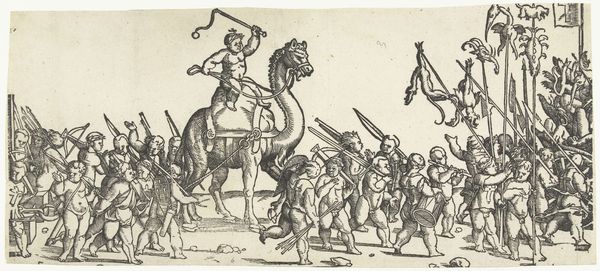 Nicolaas Hogenberg created this print, ‘Vaandeldragers, plaat 6,’ using engraving techniques sometime around the 16th century. The image depicts a procession of flag bearers, armored soldiers, and horse riders. The flags are emblazoned with symbols of authority and the word ‘Libertas’ or ‘Liberty’ suggesting a commentary on civic identity. Hogenberg was working in the Netherlands at a time of significant political and religious upheaval. The Dutch Revolt against Spanish rule was fueled by desires for political and religious freedom. Given this context, this print seems to be about the public role of civic institutions at a time of war. Is it self-consciously progressive? The image hints at a political movement centered on the idea of freedom. As historians, we might consult pamphlets and other printed materials from the period to investigate the social conditions that gave rise to this imagery. By understanding the context, we may discover the artwork's meaning as something contingent on social institutions.