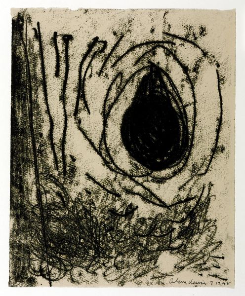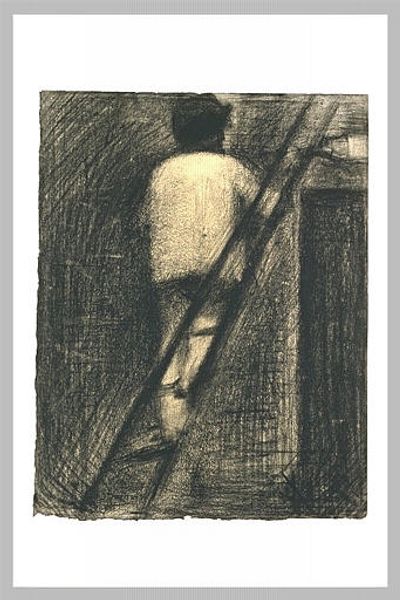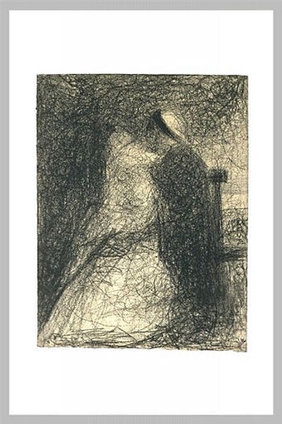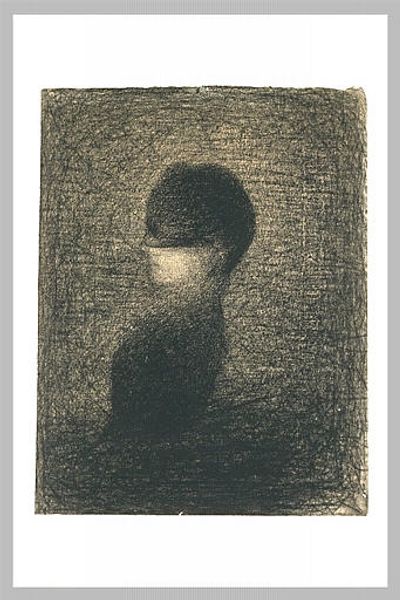 Editor: This is Georges Seurat's graphite drawing, "At work the land: man's face in profile, leaning forward." The somber lighting gives it such a weighty feel. I'm curious, what social narrative do you see reflected in this work? Curator: This drawing invites us to consider the intersection of labor, identity, and representation. Seurat, often celebrated for his pointillist paintings depicting leisure, also explored the lives of working-class individuals. The hunched posture, obscured features, and the title itself draws attention to the physical toll and the often-unseen labor that sustains society. How does this contrast with the way we usually depict workers in art? Editor: Well, that’s what strikes me, really—the facelessness and obscurity you mention. We’re left without the individuality you see in many portraits. Curator: Exactly. And it's crucial to consider what the drawing obscures as much as what it reveals. We must ask who is deemed worthy of clear representation, of visibility? Consider also that at the time, the role of the working class and peasantry were hotly debated in the burgeoning socialist movements. How does this resonate with contemporary debates about class, labor, and visibility? Editor: I guess I hadn't considered how invisibility could itself be a statement. It’s definitely given me something to think about in relation to contemporary labor issues. Curator: Precisely. By grappling with the way this work reflects and refracts social realities, we can gain insight into the persistent challenges of representation and social justice that extend far beyond Seurat’s time. Editor: This reframes my whole understanding; thanks for opening my eyes to these connections.