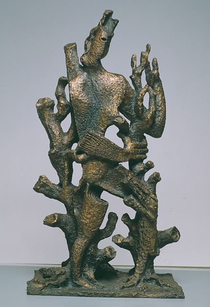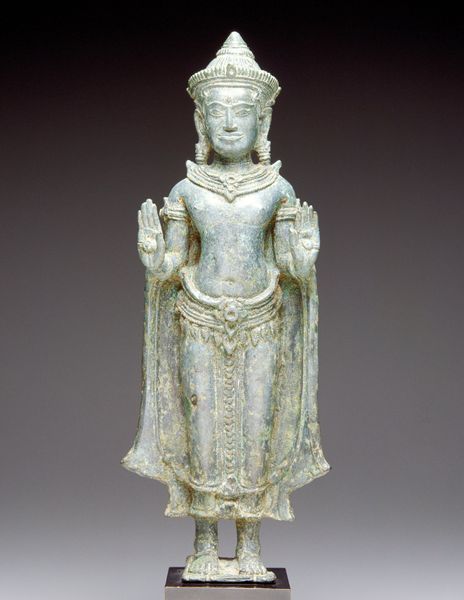 This bronze sculpture at the Minneapolis Institute of Art depicts Vishnu on Garuda. The sculpture’s green patina and compact form exude a quiet dignity. Vishnu stands atop Garuda, creating a vertical composition with intricate detailing and a complex interplay of textures. Consider how the artist uses hierarchical scale, positioning Vishnu, the supreme deity, above Garuda, his mount. Garuda’s outstretched wings create a dynamic contrast to Vishnu's static pose. This arrangement isn't merely representational, it also signifies a structured relationship, echoing themes of power and subservience in philosophical discourse. The choice of bronze, a durable material, adds to the sculpture's presence, suggesting permanence and resilience. Note how the patina, a visual sign of age and exposure, adds layers of meaning. Ultimately, this bronze sculpture acts as a cultural artifact, embodying complex narratives about divinity, devotion, and cosmic order, inviting ongoing interpretations.
