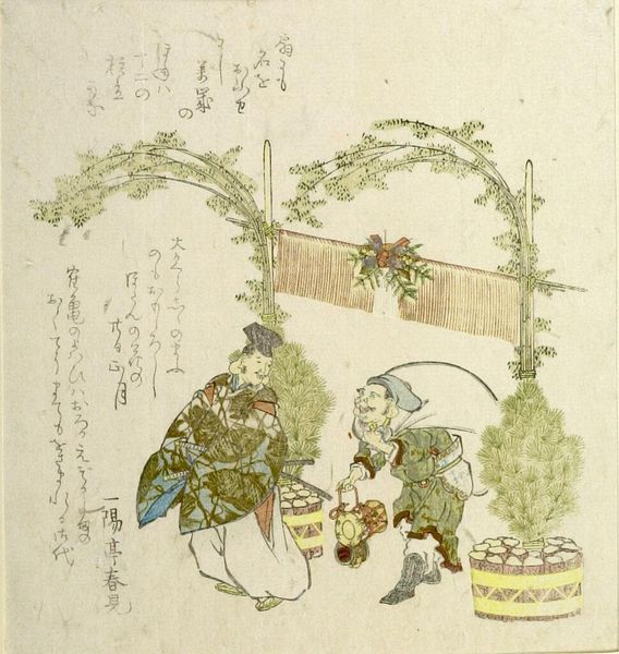 Editor: This print by Yashima Gakutei, part of the series "Twenty-Four Japanese Paragons of Filial Piety," depicts Ono no Takamura. The subdued colors give it a serene, almost melancholic feel. What can you tell me about the symbolism at play here? Curator: The figure working while another relaxes carries significant weight. This image reflects filial piety, suggesting duty and respect for elders, but the specific depiction of labor and leisure might also hint at social class or gender roles within that filial context. What emotions are evoked in you by this relationship? Editor: It makes me think of the responsibilities we have to our families and how those responsibilities can vary greatly. Thanks for illuminating that! Curator: My pleasure. It is intriguing how a seemingly simple image can hold layers of cultural meaning and personal interpretations.