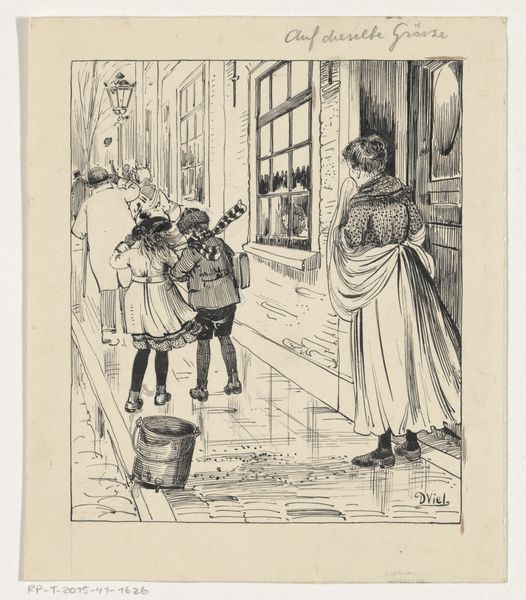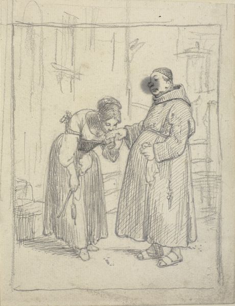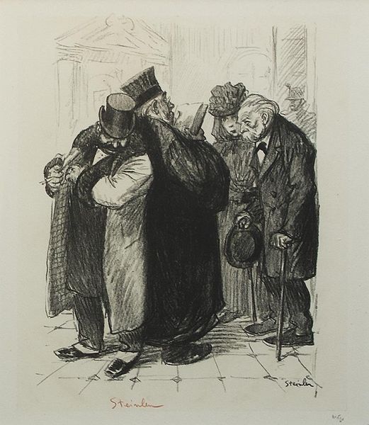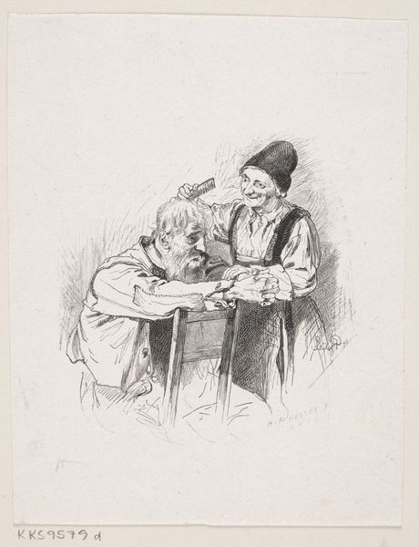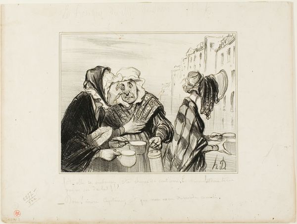 Curator: Welcome, everyone. We're looking at Honoré Daumier's lithograph from 1842, "Le Tondeur de Chiens," or "The Dog Clipper." Editor: Immediately, I see an air of patient resignation. The scene, though mundane, has a gentle sadness to it. The stooped figures and subdued tones create this very palpable atmosphere. Curator: Indeed. Daumier was quite invested in representing the plight of the working class and those on the margins. Here, we observe the everyday labor involved in grooming animals in 19th-century Paris. Consider the social context of such labor. The very idea of grooming dogs speaks to changing economies of pet ownership, status, even cleanliness. This isn't a grand portrait but a snapshot of the informal economies of the street. Editor: It is telling. The old woman in the image appears deeply concerned, almost prayerful. I see her as embodying the anxiety surrounding change. She's a figure burdened by the weight of societal shifts, clinging to tradition, perhaps, represented by her simple clothes and basket. Look at how Daumier uses line to delineate her face, capturing both her concern and the possible desperation of poverty. Curator: Right, her presence adds another layer of commentary, as if contrasting old ways of seeing things with this newer practice of tending to pets as a paid service. Think about what it means to literally shear the “wildness” of these animals to integrate them into polite society. This is further echoed by the rather unkempt dog shearer versus her refined stance and clothes. Editor: And isn’t that “poster” above their heads almost ironic? Showing perfect dogs at play compared with the quiet dejected reality. The image underscores this contrast and the symbolism of appearances versus reality. Curator: I see your point, the image seems to hint at the disparities in economic circumstances—the idealized and sanitized vs. the daily, lived experience of working Parisians. It’s a material critique in visual form, subtly woven into a genre scene. Editor: A visual metaphor then, Daumier captured a seemingly small scene teeming with symbolic weight and melancholy. Curator: Absolutely, seeing how class struggle played out through something as simple as grooming says a great deal about 19th century Parisian society. Editor: It does leave one to think about the cultural codes embedded even in something so mundane.