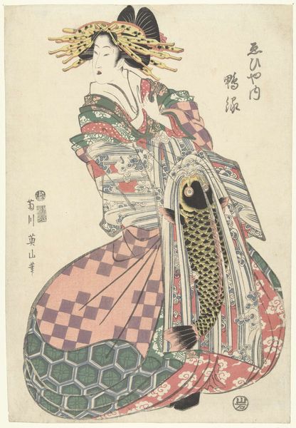 Curator: This woodblock print, dating from around 1720 to 1740, is by Okumura Toshinobu. It’s titled "Actor Ichimura Uzaemon as a Comb Vendor.” Editor: The palette is striking – warm reds and yellows offset by the almost severe black linework. There's a real balance in the composition despite the apparent imbalance of the load he's carrying. Curator: Absolutely. That “load” reveals a lot. What appears at first glance to be a simple vendor’s wares becomes complex when we recognize Ichimura Uzaemon, a celebrated actor, playing a role within a role, embodying labor. It blurs boundaries. He is a performer presenting a comb vendor. This reflects the vibrant, often fluid social identities in Edo-period Japan. Editor: The visual weight, then, mirrors a conceptual weight. The object's physical design echoes and emphasizes social issues with each color layer, which is not necessarily simple to obtain in woodblock prints. And then consider that he is, himself, made to look like an object! Curator: Indeed. Notice the way the comb boxes themselves mirror miniature stages, almost. These spaces allowed commoners access to stories, news, trends and sometimes, political commentary, circumventing the rigid structures imposed by the shogunate. The Ukiyo-e style was, itself, subversive in this respect. Editor: And the way the lines describe form! Minimal, yet so precise. Each curve communicates so much. It is highly impressive how his expression is so defined with so few elements. Curator: He looks to the side, doesn't he? As if beckoning someone to enter this intersection of theater, commerce, and identity. What this artwork presents is a layered performance, a play within a print, questioning fixed roles and societal expectations. Editor: It’s a compelling distillation of form and function and what you point out reveals a wealth of social critique in even the smallest details. It makes you consider the significance and multiple possibilities inherent in representation. Curator: Right! Hopefully our listeners will reflect on what they've observed here as well. Editor: It is time for our listeners to reach new viewpoints about it!