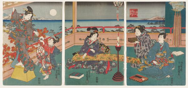 Curator: This color woodblock print, titled "Ono no Komachi," was created by Utagawa Hiroshige around 1843 to 1846. You can find it here at the Minneapolis Institute of Art. What are your initial thoughts? Editor: There’s a definite sense of interiority here, a quiet domesticity punctuated by a single flame. The materials feel very immediate and unadorned – paper and ink, worked meticulously but still humble. Curator: The figure is, in fact, the poet Ono no Komachi, one of the Thirty-Six Immortal Women Poets. It speaks volumes that she's set indoors like this. Traditionally, she represents faded beauty and the melancholy of aging. This scene echoes that. Notice how the blossoming cherry tree, a symbol of fleeting beauty, looms just outside. Editor: It’s fascinating how the blossoms just brush the darkness of the night sky. You can almost feel the artist pushing and pulling at that binary. Speaking of contrast, consider the way the print was created—the process itself mirroring those themes of transience through carving and impression. The layers of woodblock giving way to this delicate moment of illumination within a temporary enclosure. Curator: Indeed, it suggests the psychological space of Komachi’s reflections. Look closely; she isn’t just present but embodies remembrance. Even the phoenix on the wall panel speaks to cycles of decay and renewal, life and death— Editor: I appreciate you pointing out the wall panel – but to me the artistry with which textiles are rendered underscores the context in which Komachi may have lived and worked as a creative professional. The attention to rendering these fine, patterned goods brings a keen awareness of craftsmanship and perhaps the value attached to certain goods in Japan at that time. Curator: I see your point. It's not just about capturing the symbol, but also recognizing the world those symbols existed within and spoke to. Editor: Absolutely. I came to this looking for social clues in materiality, but am now considering how process and artistic choices become intrinsically intertwined when expressing historical realities and their reverberating symbols. Curator: That tension between concrete details and intangible meaning is precisely what keeps these historical pieces relevant.
