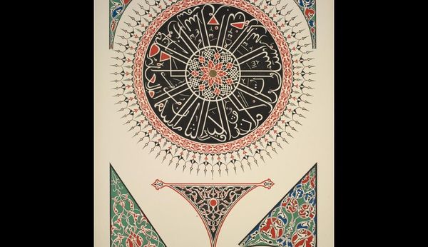 Curator: "Turkish No. 1," created in 1856 by Owen Jones. It’s a graphic print showcasing a range of decorative motifs rooted in Islamic art. The work epitomizes the broader Orientalist movement of the time. Editor: The intricacy is striking. There's a harmonious layering of geometric shapes and vibrant colours—blue, red, gold—creating this elaborate, almost hypnotic pattern. Curator: Jones was hugely interested in the cultural context behind ornamentation. His patterns were drawn from his travels in Egypt, Spain, and of course, Turkey. Jones saw decorative art as reflecting broader cultural values. These visual motifs weren’t just aesthetic, they encoded historical narratives of exchange and power. Editor: Absolutely, there’s definitely an argument to be made for appreciating them as visual signifiers first. Consider how Jones uses repetition. He meticulously arranges abstract forms, achieving both symmetry and a kind of visual rhythm. How might we unpack the underlying structural principles at play? Curator: Precisely. Jones, despite the visual splendor, had some blind spots shaped by his historical and colonial contexts. For instance, "appropriation" is an appropriate word to employ here. As a cultural outsider, what was his actual depth of understanding? Or how were these designs then co-opted, stripped of their original significance in British aesthetic theory? Editor: I concede. Perhaps my semiotic impulse overlooks crucial sociopolitical readings of decorative Orientalism as a symptom of the Empire. Still, though, I find myself in awe of the sheer technical expertise shown in this image and that can be divorced from this somewhat. Curator: A balanced point. These sorts of questions are central to unlocking deeper insight. Appreciating it within the frame of design and cultural legacy enables new understandings of Jones’s work. Editor: Indeed, thank you for elucidating both sides of a really rather lovely design!