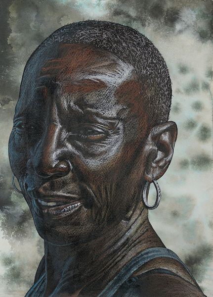 Alfred Conteh created this striking portrait, "Ebony," using mixed media on wood. The textured surface and contrasting colors immediately draw the eye. A serene, ebony-skinned face is set against a mottled background of rust and sky blue. Conteh’s meticulous use of line and shading gives the subject a palpable presence. The composition invites us to consider dualities: the smoothness of the skin against the roughness of the wood; the dark, detailed portrait against the abstract background. This juxtaposition can be interpreted through a semiotic lens, with the portrait acting as a signifier of identity and the background representing the complexities of historical and social contexts. The rust and blue could symbolize both decay and hope, prompting reflections on memory, resilience, and transformation. In essence, "Ebony" uses formal elements to engage with profound themes. It reminds us that art is a continuous dialogue, inviting ongoing interpretations and challenging fixed meanings.