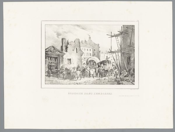 Charles Rochussen created this print, “Gezicht op de Grotemarkt te Rotterdam”, using etching. The composition is structured by a contrast between the ordered architecture of the buildings and the vibrant chaos of market activity, set against a muted palette. The lines of the buildings are sharp and geometrically rigid, establishing a formal backdrop to the scene. Rochussen uses a semiotic interplay of order versus disorder. The artwork, at first glance, seems to simply represent a marketplace, but it also hints at how social structures shape everyday life. The ordered environment contrasts with the unpredictable nature of human behavior, suggesting a structured social framework. The lines and spaces within the architecture serve as boundaries, defining how people interact within the city's public sphere. The buildings are therefore, not just physical structures, but also represent social constructs.