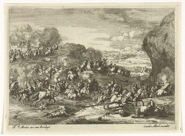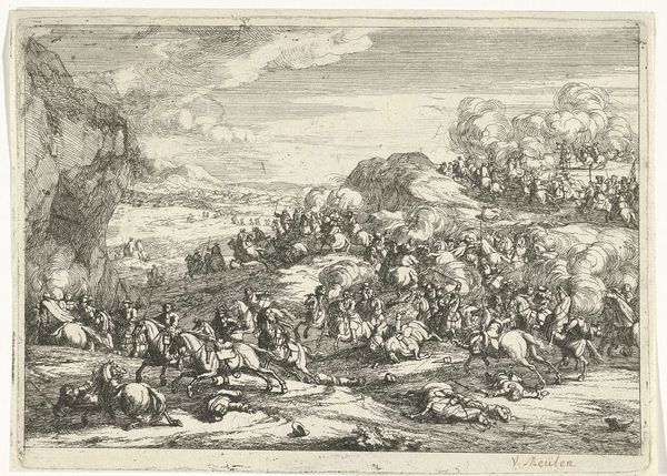 Joseph Mulder created this print titled 'Slag van Lekkerbeetje' around 1700 using etching techniques. This image offers a window into the Dutch Republic's self-fashioning during its Golden Age. Battles like the one depicted here were crucial in defining the nation's identity. But how does Mulder, working decades later, shape this memory? Note the chaotic yet ordered composition, common in battle scenes, which emphasizes Dutch courage and strategic prowess. The print also speaks to the era's burgeoning print culture, where images played a vital role in shaping public opinion. Studying period publications, pamphlets, and other visual materials can provide deeper insights into the cultural and political meanings embedded in this work. What was the role of the Rijksmuseum, where this image is housed, in shaping Dutch national identity? By looking into these sources, we can understand how art both reflects and actively shapes the social and institutional contexts of its time.