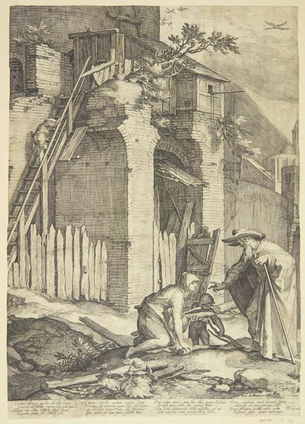 This etching, titled 'Uitgebrande bakkerij op Vlooienburg', was created in 1682 by an anonymous artist. The print captures a scene of devastation with intricate detail. Notice how the artist uses line and texture to depict the charred remains of a bakery. The composition employs a stark contrast between the skeletal framework of the destroyed building and the relatively intact structures looming in the background. This juxtaposition highlights the violence of the fire, but also the resilience of the urban landscape. Observe the meticulous rendering of the debris. The artist's formal approach invites a meditation on the transient nature of human endeavors. The print functions as a semiotic marker, pointing beyond the immediate scene to broader themes of destruction, renewal and the cyclical patterns of history.