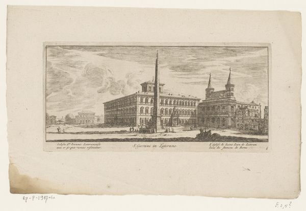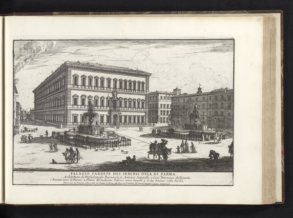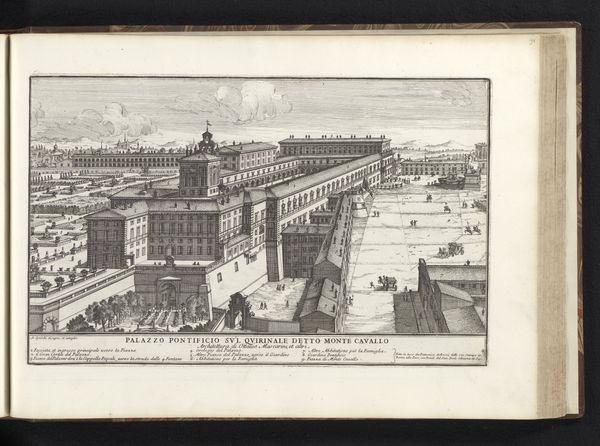 Giovanni Battista Falda created this print of the Quirinal Palace in Rome in the late 17th century. During this time, Rome was a city undergoing significant transformation, reflecting the power and authority of the Catholic Church. Falda's print is a visual document of that transformation. The Quirinal Palace itself served as a papal residence, and later as a royal palace after the unification of Italy, symbolizing shifting powers. The architecture emphasizes the grandeur and authority associated with these ruling entities. Observe the figures populating the scene. Who are they? What is their relationship to the palace? This print invites us to consider not only the physical structure of the palace but also the social dynamics and power structures it represents. It captures a moment in time, a snapshot of Rome during an era of significant change, prompting reflections on history, power, and the ever-evolving nature of identity.