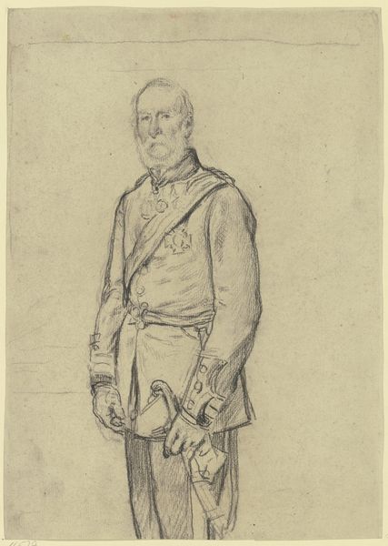 Curator: I find myself immediately drawn into the eyes of this military portrait. The subject conveys an immense amount of reserved strength, doesn't he? Editor: Definitely. And looking at this work on toned paper at the Städel Museum, made with a light pencil work, my initial feeling is intimacy and perhaps vulnerability; a kind of access we usually don’t get with military figures. What do you read into the iconography? Curator: Military uniforms have historically been worn not just for identification but also for projecting authority. A symbol that suggests order, discipline, and national allegiance, almost invariably referencing military honor and duty, regardless of a soldier’s individual circumstances. Editor: Yes, but this one feels quite informal. And I see more than that: the method of the artist Otto Scholderer in sketching a man in uniform also points towards the significance of art schools in 19th-century Europe, offering military portraiture as an excellent subject of study due to its structured form and historical symbolism. Curator: A compelling observation, given that the very light and loose handling emphasizes humanism in the act of looking! It could easily be dismissed as a study; the precision lies primarily in his face, a face seemingly stripped bare, in spite of its proud moustache. Editor: Precisely! The emphasis shifts to the individual—away from institutional or state power. I am struck by the lack of flourish, in favor of direct, unadorned observation of line, technique, and tonal values achieved through layering of the pencil work. We understand the craft here. Curator: And even the visible corrections invite consideration. Consider what this face would mean to him: he might have looked into the very eyes of battles won and lives lost! Editor: Ultimately, it's this sketch's rough quality, this immediate presence, that brings him closer to us as an individual and allows us a glimpse into another man's soul in the time that's past. Curator: A powerful, quiet moment. Editor: I agree, and seeing its construction reveals a much more humane message to me.