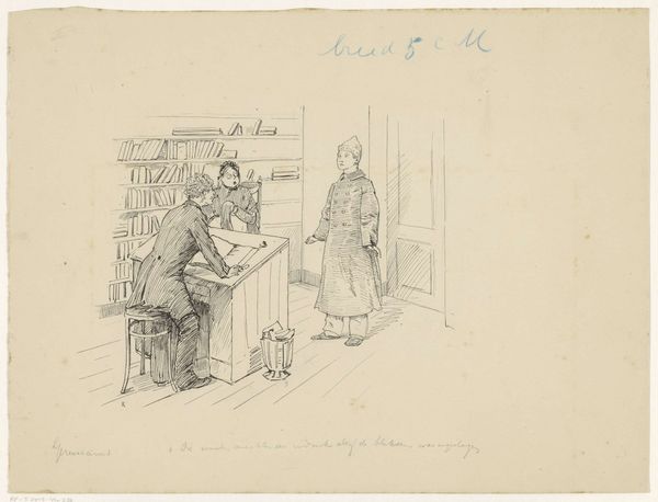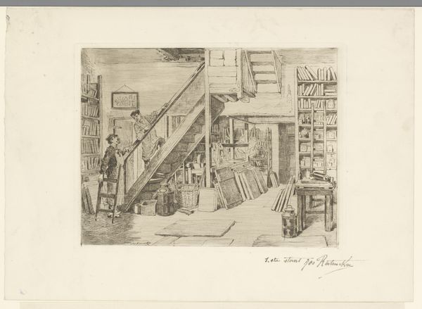 Editor: This is "Two Men by a Staircase in an Antwerp Lithography Workshop" by Jos Ratinckx, made sometime between 1870 and 1913, using drawing, ink, and paper. It’s a wonderfully detailed scene. I'm struck by the intimate glimpse into the working life, but also by how... cluttered it all is! What strikes you most about this piece? Curator: The seeming chaos is exactly what interests me. Look closer; what story can we tell of labour conditions from 19th-century lithography, especially how it represents Antwerp and perhaps Flemish identity? Where would these men find themselves in the art historical narrative? Consider also the social status of the men depicted and the power dynamics inherent in the artist representing them. Editor: I see what you mean! It makes me think about who had access to create art at that time. And who *didn't*. The focus on this everyday scene hints at the artistic democratization that was maybe beginning, moving away from purely depicting nobility or religious scenes? Curator: Exactly. Art production itself was changing. What can this lithography workshop tell us about shifts in art and labor? Editor: The composition almost makes the men feel like subjects of study, more than active participants. I am beginning to feel uneasy; like, what if they weren’t paid fairly or treated well? Curator: This uneasiness is important. Consider art as a form of documentation, complicit perhaps with systems of power, but also capable of revealing their inherent inequities, like these conditions we are talking about. What did art production mean to the labor class in the 19th Century? Editor: Thinking about the social and political implications really changes how I see this piece, from a quaint scene to a reflection on labor, access, and representation. I'll never see art the same way now. Curator: Wonderful. Analyzing artworks with a keen awareness of historical and social dynamics can open new perspectives and spark profound discussion. Always question!