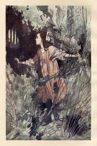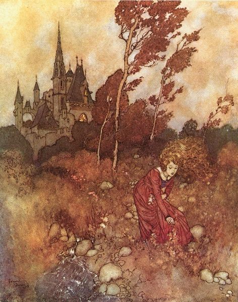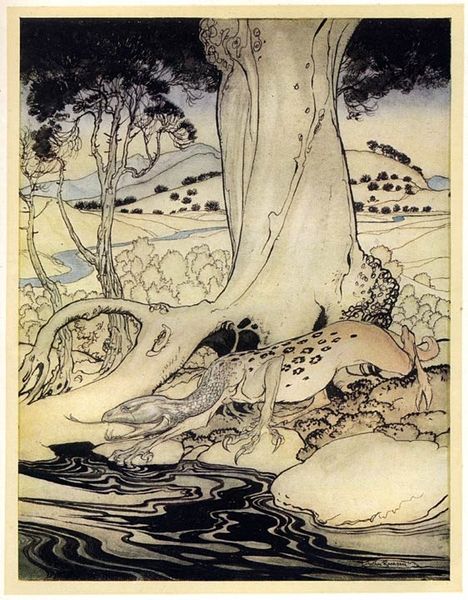 Editor: This is Arthur Rackham’s drawing, “Once upon a time a poor Peasant, named Crabb, was taking a load of wood drawn by two oxen to the town for sale”, created using ink and watercolor. I'm struck by the composition—the winding lines of the water and the layered architecture create a sort of fairytale-like atmosphere. What do you make of this piece? Curator: Indeed. Notice how Rackham structures the image using the contrasting textures and lines. The rough stonework of the bridge anchors the composition, its solidity played against the fluid, almost frantic, lines depicting the water. The pen and ink create defined boundaries, particularly noticeable in the buildings and figures. The colour washes serve to emphasize shape and texture, without overwhelming the structural linework. Editor: So the structure comes primarily from the linework rather than the washes? Curator: Precisely. Consider how the architectural elements on the horizon contribute to the image's structural depth. The bridge bisects the scene. It serves to frame the narrative while the detailed foreground compels close inspection. Are the choices in applying the watercolors intentional, do you think? Editor: It almost seems to separate depth? Creating distance through tone? It’s subtle but very effective. I'm drawn to how these technical aspects work to create depth and a narrative pull. Curator: I agree. The colour adds dimensionality but notice, also, that this is an extremely flat piece with a highly compressed spatial rendering. It has some similarities with Japanese woodblock prints which have some structural parallels. The artwork really invites one to deconstruct its structure to admire the way the whole comes together. Editor: It’s interesting to consider how different art historical styles might converge through structural form. I initially missed so many subtle details! Curator: Indeed, visual analysis reveals many complexities once we examine these artistic choices closely!