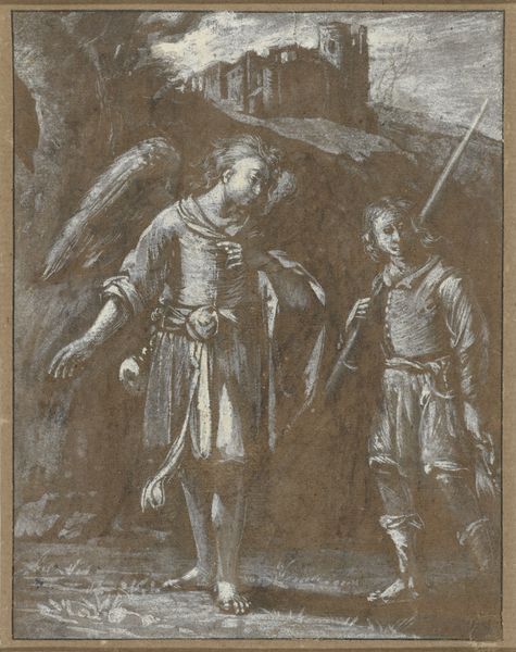 Here we have a drawing made with pen and brown ink, with touches of white gouache, on brown-primed paper. The drawing, called "A Standard Bearer," is currently held at the Metropolitan Museum of Art. At first glance, you're immediately struck by the figure's ornate attire, emphasized by dense, rhythmic lines. These lines define the puffy sleeves and breeches, creating a sense of volume and texture. The contrast of the ink against the brown background flattens the depth of field, pushing the figure to the foreground. The choice of the standard-bearer as a subject taps into a history of military and civic pride, yet it subtly destabilizes traditional heroic representations. The figure's almost theatrical costume might critique the pomp of military authority. The drawing's graphic style, employing outlines and contrasts, turns the figure into a pattern of codified signs of status and power. Note the way the artist uses the brown paper not just as support, but as an active element in the chromatic scale. The drawing becomes a play of figure and ground, where meaning emerges from the visual interplay. This tension between surface and depth challenges our interpretation, reminding us that art is always an ongoing process of visual and intellectual engagement.