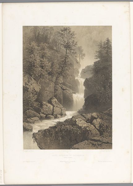 Editor: So, this is Alexandre Calame's "Landscape," an etching made sometime between 1830 and 1864. The overwhelming feeling is of a deep, isolated space. What strikes you most about this landscape? Curator: It's a masterclass in the Romantic ideal, wouldn't you say? Notice how Calame positions the viewer. We're placed on this rocky outcrop, separated from the sublime, vast expanse before us by the rushing water. This echoes a common Romantic theme: nature's overwhelming power juxtaposed against human insignificance. But is that *all* that it projects? Editor: I suppose not, or you wouldn't ask! It also makes me think of the sublime as both awe-inspiring and a bit frightening. The towering mountains feel protective, but the limited palette adds this layer of seriousness. Curator: Exactly. Consider too, the prevalence of evergreens. The presence of those resilient forms speaks to continuity and endurance, the enduring power of nature against the fleeting nature of human existence, our vulnerability against an ancient and overwhelming background. In an etching like this, the seemingly simple composition invites the viewer into this timeless cycle. What will you take from it? Editor: The symbolism is deeper than I initially saw, particularly the enduring presence of the trees, connecting human fragility with a more permanent world. Curator: Indeed, each viewing can excavate new meanings from symbols old and new.