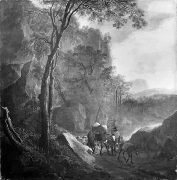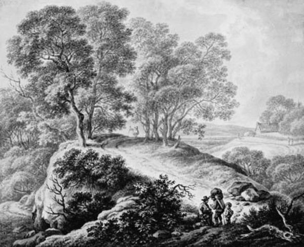 Editor: This is "Landskab med kvæg og hyrdepar," a landscape by Johann Christian Klengel, dating sometime between 1760 and 1824. It's a drawing, so ink on paper I presume, and the scene, rendered in monochrome, presents a serene, almost idyllic pastoral setting. I’m struck by how seemingly simple the composition is. What are your thoughts? Curator: The "simple" composition is precisely where we should start, actually. Consider the labor involved in producing the paper itself, and then the skilled hand required to create this nuanced scene. What appears effortless reflects a complex chain of material and human inputs. Where were the raw materials sourced? Who processed them? This drawing exists within a network of production and consumption. Editor: So you’re focusing on the physical processes that led to this image? Curator: Absolutely. Look at how Klengel represents labor in the scene – the herdsmen are almost romanticized. But what about the unromantic labor required to sustain the very society that produces art like this? The consumption patterns enabled by those labor systems made art production possible. Does that tension change your perspective? Editor: It does. I was initially just appreciating the aesthetic, but now I’m considering the socio-economic forces that underpin the artwork's existence. How the landscape almost obscures a church behind trees… Curator: Indeed. The artist and the drawing are both embedded within – and products of – the society that produced it, just like the workers and landowners, no? What new perspective are you walking away with today? Editor: I am reminded that the art object doesn't appear from thin air, there is an element of power, consumption, and labor built-in. This provides an entirely fresh point of view for the piece, and similar works. Curator: Exactly. Remember to ask 'how' and 'why' was it made.
