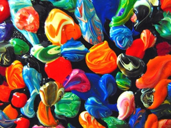 Editor: This is 'PLACNTON II' created by Requena Nozal in 2017, using acrylic paint. At first glance, the dark background makes the various colored shapes really pop. What are your initial impressions? Curator: From a formalist perspective, the interplay of color and form is immediately striking. Observe how the artist manipulates the negative space; the black matrix pushes the chromatic, amoeba-like shapes forward. It creates a dynamic tension, a visual vibration across the canvas. Do you perceive how the colour fields within each shape contribute to this effect? Editor: I do, the variations in hue within each shape makes the overall effect quite vibrant. Does the arrangement suggest a certain kind of movement? Curator: Precisely! The distribution, their proximity and orientation create a non-hierarchical composition that defies a single focal point. It encourages the eye to wander, establishing an all-over pattern rather typical of some modes of abstract expressionism. How does the materiality of the acrylic—its sheen and texture—play into this? Editor: I can see how the slight gloss adds depth, almost like looking into a pool of liquid. Are there other formal aspects that strike you? Curator: Notice the consistent curvature and lack of hard edges. The absence of rigid lines creates a biomorphic quality, inviting associations with organic forms or cellular structures. The shapes, while abstract, are not entirely divorced from nature. A calculated tension exists between pure abstraction and the suggestion of organicism. Editor: That's fascinating. I never thought about the contrast between the geometric forms and the more natural suggestions, and how that balance contributes to the work's dynamism. Curator: Indeed. Analyzing the composition, color palette and texture leads to a rich understanding of how this painting communicates. It demonstrates the potency of form in eliciting meaning, regardless of overt representation.