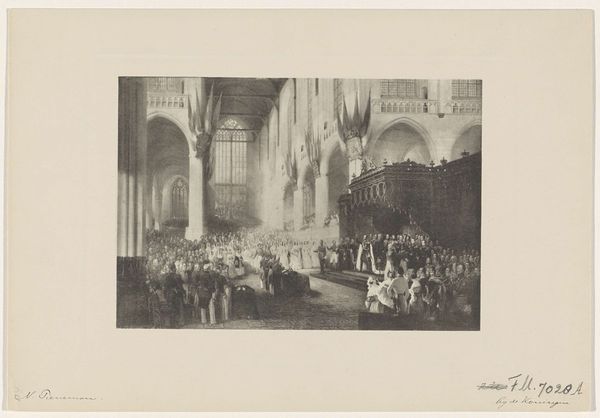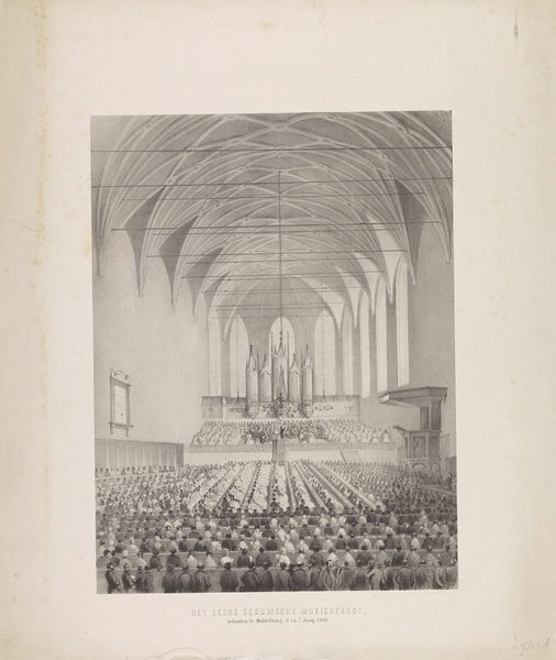 Curator: This print captures "Het 4de Zeeuwsche Muzijkfeest in de Koor der groote Kerk te Goes, 4 Junij, 1857," by Pieter Wilhelmus van de Weijer. It’s currently housed at the Rijksmuseum. What's your immediate take? Editor: It feels…dwarfing. The crowd's packed in like sardines, and the church just swallows them. I feel a bit lost in the monochrome swarm. Curator: Note how van de Weijer used engraving to depict a specific social event, a music festival. This merges the high art aspirations of history painting with the immediacy of genre painting, accessible through mass-produced prints. Editor: Right, it’s almost like an early photograph. There's a sense of capturing a moment, not just composing an image. I wonder, did they sell these prints at the festival itself? Souvenir programs, basically? Curator: Quite possibly! The distribution network is key here. These engravings made cultural events like this accessible to a wider audience, democratizing the consumption of art and culture beyond the wealthy elite. Editor: And everyone dressed to the nines! It makes you think about the whole performance of attending an event like this back then, all the societal expectations baked in. Must have taken weeks to prepare an outfit, what kind of labor was involved! It would be kind of exhausting and exciting to experience a medieval church's acoustics and social energy. Curator: Precisely. It brings up the production process, not just the artistic execution but also the clothing industry supporting it. This period, the mid-19th century, was witnessing enormous shifts in textile production, making finery more accessible, albeit through often exploitative labor practices. The print acts as an index of its time. Editor: I’m still stuck on how this piece is "romantic," which this piece seemingly labeled as. Maybe it’s in the grand scale of the church, this yearning for something bigger, even spiritual? Curator: Romanticism often idealised historical and communal events, imbuing them with heightened emotions. While rendered in a realist style, this print elevates a local festival to a scene of national cultural importance, thus fitting within a Romantic framework. It is, however, important to recognise realism, though it can still retain Romantic qualities through sentimental or nostalgic rendering. Editor: Interesting. I leave with a feeling that historical document might unintentionally convey its own feeling by documenting culture at the time. Curator: Agreed. This print layers materiality, labor, cultural aspiration, and the performance of social status—a complex document of its age.