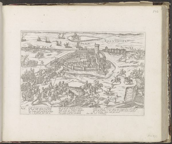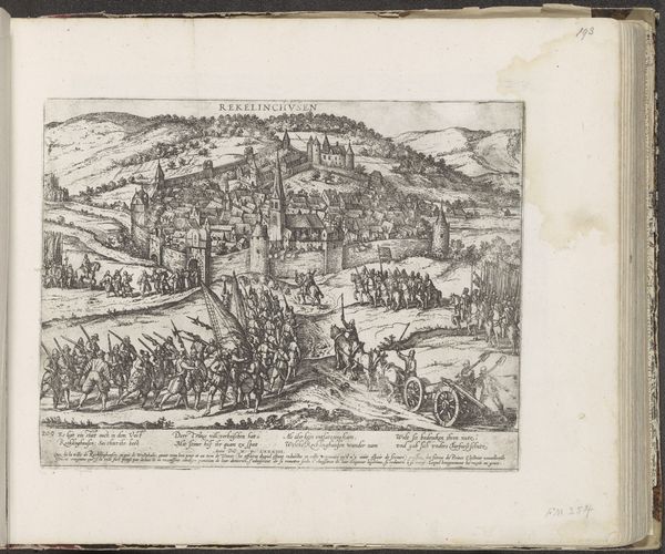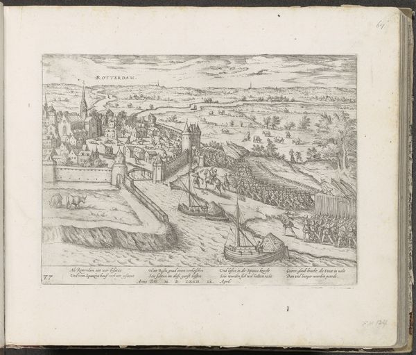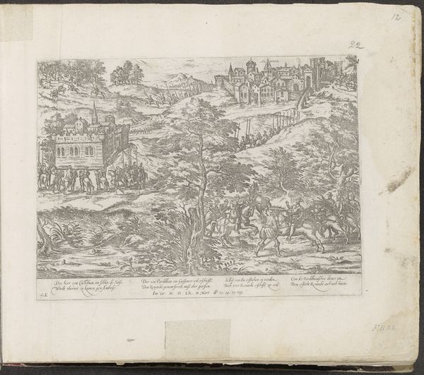 Frans Hogenberg created this print of the Siege of Dachstein in Alsace around 1610, using etching and engraving on paper. These printmaking techniques were crucial in disseminating information, essentially acting as early forms of mass media. Look closely, and you can see how the linear precision of the engraved lines allows for incredible detail. Consider how this painstaking process contrasts with the chaotic scene it depicts, of armies in conflict. Hogenberg utilized established skills that developed through generations of craftsmanship. The print has cultural significance as a historical record, and reflects the political and social context of its time. Its mode of production is intimately tied to the burgeoning print culture of early modern Europe. This allowed for the broad circulation of news and propaganda, deeply influencing public opinion and political discourse. The print is not just an artwork; it's a testament to the power of reproducible media in shaping history.