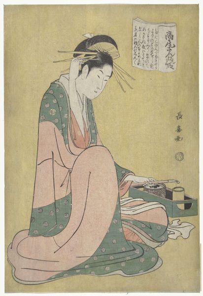 This is Utagawa Toyokuni I’s memorial portrait of the actor Matsumoto Yonesaburo I. It’s a woodblock print created in Japan, during the Edo period. During this time, Japanese society was highly stratified, and the representation of actors, who were often seen as outside the rigid social hierarchy, was carefully managed. Kabuki actors, like Yonesaburo, were popular figures, yet their status was complex. Here, Yonesaburo is depicted in a moment of repose. The memorial aspect suggests a desire to preserve his memory and perhaps elevate his social standing postmortem. Utagawa, as a prominent artist of Ukiyo-e prints, navigated the cultural expectations and artistic expression. The print invites us to reflect on the ephemeral nature of performance, fame, and identity, and its role in shaping cultural memory.
