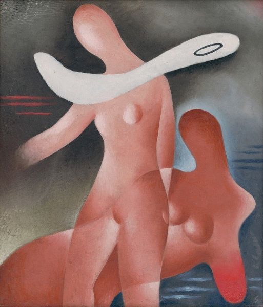 Curator: Gustave Buchet’s “Frauenakt,” created in 1930 using oil paint, immediately strikes me as an exercise in geometric simplification of the female form, influenced by cubism and early modernism. Editor: It feels melancholic, almost muted. The color palette of browns, grays, and blacks is heavy. There's an almost statue-like quality that distances the viewer. Does it symbolize the alienation and objectification of the female body in early 20th century society? Curator: That's a compelling perspective! Considering the social context of the interwar period, the flattened and angular depiction of the nude female body could be interpreted as a critique of traditional patriarchal representations and beauty standards. It's almost a deconstruction of the male gaze through abstraction. Editor: Looking closely, the artist included some recurring symbols, which seem to draw from antiquity and which would allow the viewers to instantly recall particular aspects from our culture. The orb floating adjacent to the figure's chest immediately draws the eye, and might reflect the desire for immortality, perfection, and totality, but placed near the bosom can that meaning possibly shift to the erotic instead? Curator: Indeed, the placement of this single object draws one's focus to the corporeal. Considering this painting engages cubism, we need to consider this motif and its intersection with representation itself. Does that orb represent a "wholeness" or sense of potential related to identity, especially to gender identity during this historical moment? And how would we factor in other possible philosophical approaches like surrealism, which also focuses on symbols? Editor: I appreciate the point you make concerning the possible intersections with surrealism; yet, here it feels as though this is something else, rooted less in the unconscious than in conscious manipulation of signifiers. Its muted tones do not lend it that vibrant or rebellious air as one might find elsewhere. Curator: Perhaps Buchet sought to navigate the established language of nude portraiture to depict the changing identities and roles of women at the turn of the century. We could further examine its influences in relation to early 20th century cultural shifts. Editor: Ultimately, this image will remain stuck in my mind due to its heavy yet curious aura, that quiet yet strange quality about it. Curator: Agreed; it’s certainly a piece that demands we question the established aesthetic frameworks and the position of women within them.