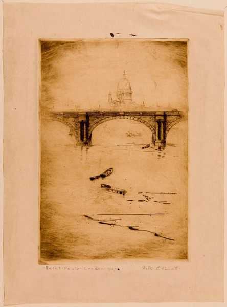 Editor: This is Walter E. Trevett's "Mount Saint Mammon," an etching. The hazy cityscape feels almost apocalyptic. What do you see in this work? Curator: Well, let's consider the materials and the etching process itself. Each line represents labor, a physical engagement with the copper plate. And "Mammon," a biblical term for wealth... what did the artist intend here? Editor: Maybe he was critiquing capitalism and the cost of industrial growth? Curator: Precisely! The print, as a multiple, democratizes this critique. It asks: who consumes this image, and what's the social cost of that consumption? Editor: That gives me a lot to think about regarding the purpose of the piece. Curator: Indeed. Considering the means of production opens up a whole new perspective.