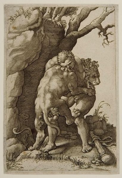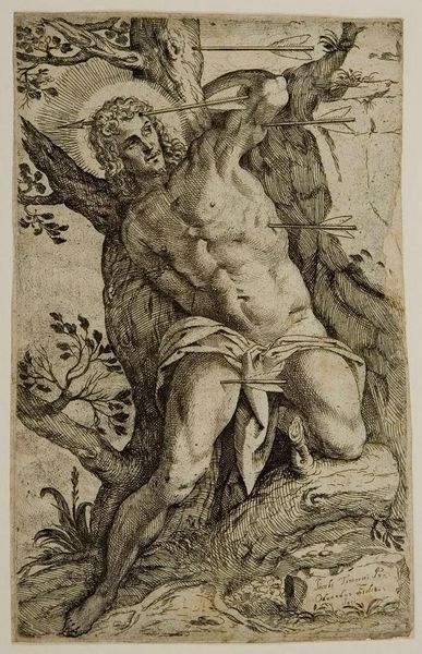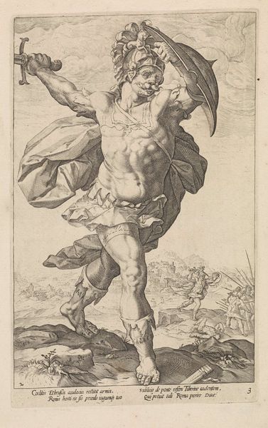 Editor: Here we have "Fire," an engraving of unknown date by the Workshop of Hendrick Goltzius. The figure is striking, and somewhat unsettling. What strikes you first about this piece? Curator: It's a powerful statement about the role of classical imagery in asserting cultural authority. This representation of "Fire" as a near-nude male figure taps into a long tradition of associating the classical body with power and control. The figure is idealized, but how does the artist use this ideal to convey a message about fire itself, its control, or lack thereof? Editor: So, it's less about the beauty of the figure and more about what that figure represents in a broader social context? Curator: Precisely! The image's power lies not just in its aesthetic appeal, but in its calculated deployment of classical forms to communicate ideas about power, knowledge, and even civilization itself. Editor: I never would have considered the politics of the figure! Curator: Thinking about art in terms of its public role, and how it communicates with and shapes society, opens up new avenues for understanding its enduring appeal.