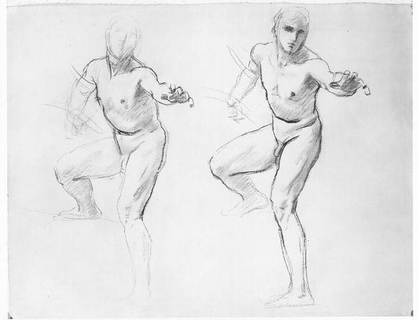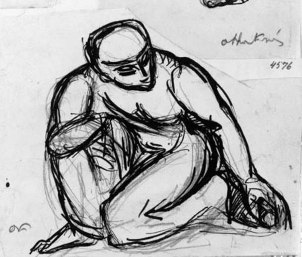 This sketch, "To studier af arbejdende mænd" by Othon Friesz, presents us with two figures rendered in swift, confident strokes of ink on paper. The composition, though minimal, pulses with energy, capturing the essence of labor through dynamic lines and forms. Friesz masterfully uses line to define shape and movement. Notice how the hatching creates volume and the density of the marks suggesting musculature and strain. The figure on the left, reaching upwards, is constructed with an economy of line that speaks volumes about the body’s tension and exertion. The opposing figure, hunched and in motion, provides a counterpoint, a study in weight and momentum. This work exists within a lineage of modernist explorations into form and function. Friesz reduces the figures to their most essential gestures, embodying the spirit of early 20th-century investigations into the relationship between art, labor, and representation. It is a work that acknowledges the physical realities of work, while simultaneously abstracting them into a study of pure form.