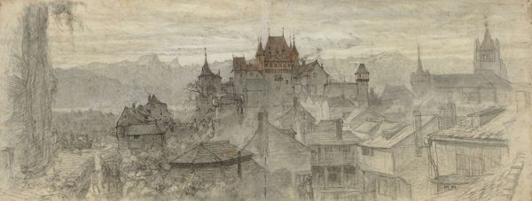 Editor: Here we have Jan Matejko’s “View from the Town Hall Tower,” painted in 1857, using oil paints. The warm tones and perspective give me a sense of being enveloped by the city. What stands out to you? Curator: Notice how the composition directs our gaze. The artist uses the architectural lines, primarily the rooftops and facades, to draw the eye upwards to the towers and the sky. The interplay of light and shadow creates depth, yet observe how the details soften into atmospheric perspective in the distance. How does the materiality of oil paint contribute to this effect? Editor: I see that the layering creates a sense of texture, especially in the rendering of the brickwork, but also, conversely, contributes to the hazy background... So you're seeing the oil paint as intrinsic to this overall formal structure, this perspective and depth? Curator: Precisely. Consider the formal relations between the colours themselves. The dominance of the red-brown hue unifies the cityscape, contrasted only by the band of blue. Ask yourself: what impact does this limited palette have on the overall structure and mood? How might a different choice of colors alter your perception? Editor: I suppose it streamlines everything. It does create a harmonious feeling but maybe somewhat static? This deep dive has really clarified how formal elements shape our interpretation. Curator: Indeed. Analyzing structure allows us to appreciate the choices an artist makes in shaping visual experience. Every brushstroke contributes.