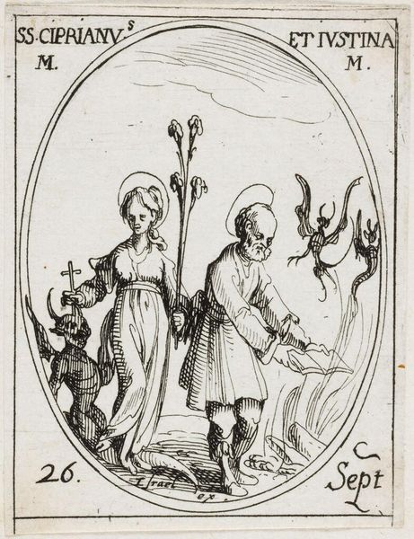Curator: This is Jacques Callot's "Saint Lucy," a small print now held in the Harvard Art Museums collection. Editor: It's striking how the artist uses such fine lines to convey such a dramatic moment. There is such a palpable tension in the air. Curator: Absolutely. Callot, who lived from 1592 to 1635, was a master of etching. This piece exemplifies how prints circulated religious imagery and ideas. Editor: And consider Saint Lucy herself. Here's a figure who, throughout history, stood as a symbol of hope, strength, and resistance against oppression. Curator: It’s incredible to think how a piece this size could have played such a significant role in shaping cultural narratives. Editor: Indeed; it shows us how the art of yesterday intersects with the struggles of today.