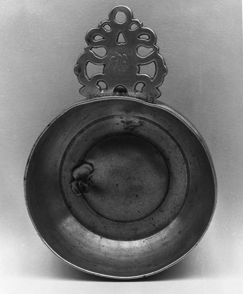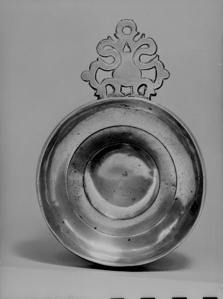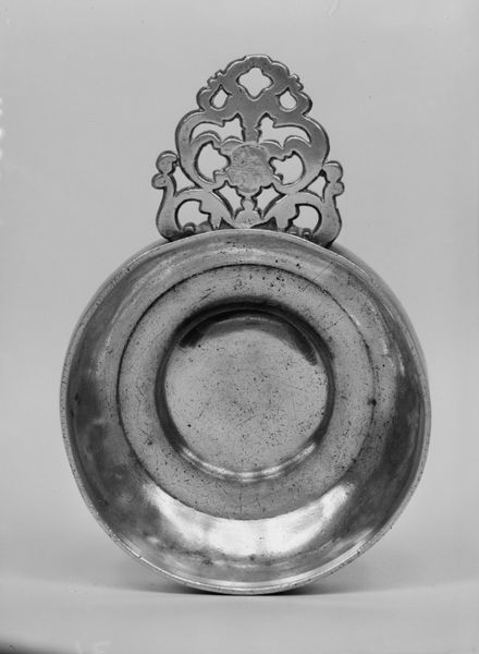 Curator: Let's take a moment to look at this porringer crafted by Josiah Danforth, likely between 1821 and 1846. It’s currently held here at the Metropolitan Museum of Art. What’s your initial read of this piece? Editor: Immediately, the interplay of circles strikes me. The bowl's round form contrasts with the decorative handle’s almost frantic ornamentation—spirals contained by rigid geometry. It's a very appealing formal tension. Curator: That tension extends, I think, to the social implications of the object itself. The porringer, though seemingly simple, speaks volumes about colonial New England domestic life and material culture. Think about access, labor, gender… who was being served with this bowl? Whose hands crafted it? Editor: True, context undeniably deepens the work. But if we focus on materiality alone, look at how light glides across the polished metal! Notice the subtly concaving lines within the bowl. It possesses a self-contained world of reflected luminosity. The monochrome palette enhances the play of light, turning utilitarian into beautiful. Curator: The choice of material is telling; metal symbolized status and permanence, but also practicality. It suggests aspirations of stability for a young, still-forming nation, perhaps particularly within households seeking to establish themselves socially. Think about who had access to this. Whose labor generated this? Editor: Right, right. Beyond mere metal, however, the piece employs principles of design and a specific kind of craftsmanship. Semiotically, consider that central emptiness. Isn't it ripe for analysis, symbolizing potential, promise, a yet-to-be-written future contained? Curator: Or consider it reflecting the empty promises frequently given during this era? When we unpack ideas of ownership and privilege during this period, it really makes you consider how it's been handled and cared for over time. Editor: Absolutely. So, viewed through both social context and the formal relationships, one might start to weave multiple interpretations, adding up the work's potential cultural value. Curator: Yes, looking at it now, the interplay of these levels and connections brings this period of domestic life so much more richly to life for me. Editor: And for me, its appeal is simply, this seemingly simple shape and material invites endless fascination, contemplation, and speculation.