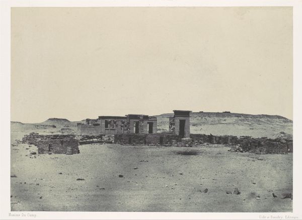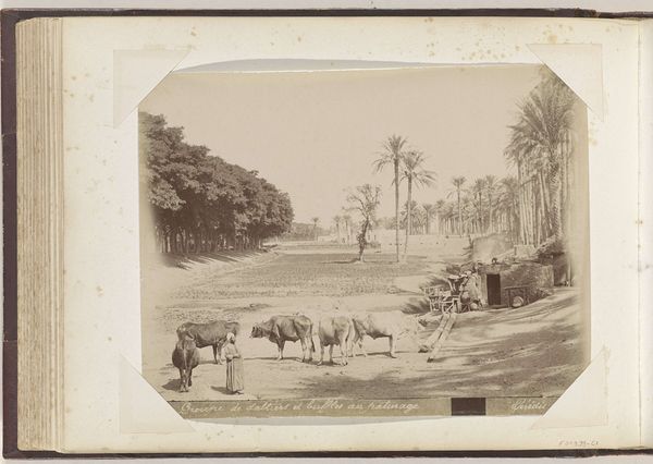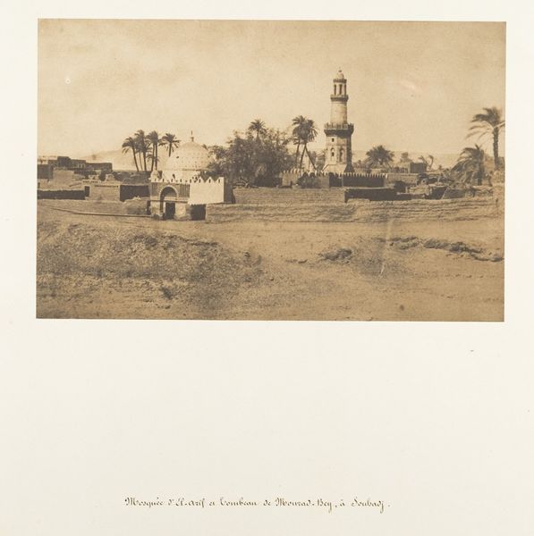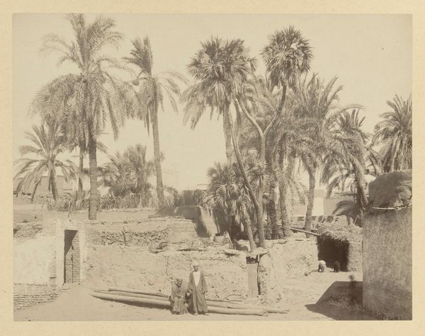 Editor: Here we have "Duiventorens in Luxor," a gelatin silver print created sometime between 1870 and 1890 by C. & G. Zangaki, housed here at the Rijksmuseum. The sepia tones and the composition, particularly the towers juxtaposed against the palms, create a serene, almost dreamlike quality. How do you interpret this work from a formalist perspective? Curator: The photograph offers a fascinating study in contrasts and textures. Observe the geometric rigidity of the dovecotes, man-made structures defined by straight lines and sharp angles. Then, consider the organic forms of the palm trees, their fronds creating a delicate, almost lace-like pattern against the sky. Do you see how this tension creates a visual dynamic? Editor: Yes, the severe geometry of the structures is softened by the organic, almost wild presence of the trees. The photographer uses natural tone to unite them as one scene. It is so very interesting. Curator: Indeed. The manipulation of light and shadow further enriches the composition. Notice how the photographer uses sunlight to define the form, casting dramatic shadows that articulate the textures of the mud-brick structures and the palm fronds. This creates a layered visual experience, a sophisticated play of form and light. Are there particular areas that grab your attention? Editor: Definitely the juxtaposition of light and shadow that gives it that atmospheric perspective. Looking at the use of natural tones across different forms certainly has enlightened me. I see now how one can create contrast, balance, and harmony! Curator: Exactly! We can move beyond representational concerns and engage with the pure visual elements: form, texture, light, shadow and the organization of space within the photographic frame. These elements alone yield so much artistic interest, without context.