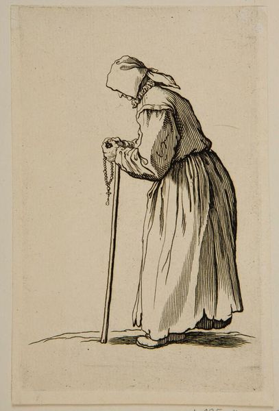 Editor: Here we have Jacques Callot's "Beggar Woman on Crutches," an etching. The stark lines create such a poignant image of hardship. What was the societal context for creating imagery like this? Curator: Callot lived during a time of immense social stratification and conflict. Images of beggars served complex social functions. Were they simply depictions of the marginalized, or were they also moralizing tools used by those in power to reinforce social hierarchies? Editor: So, you're suggesting these images might have reinforced existing power structures? Curator: Precisely. The "Beggar Woman" becomes a symbol, open to interpretation within the prevailing social and political discourse. What do you think? Editor: I hadn't considered it that way. I see the vulnerability, but the political aspect gives it another layer. Curator: It is always worth considering who commissions the image and how it might impact its reception!